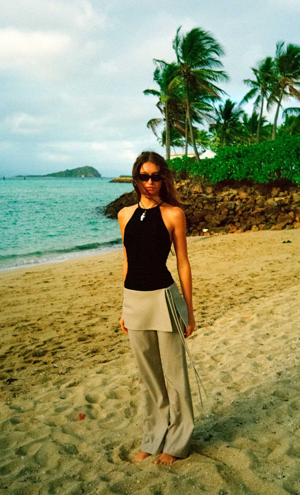 Tamsyn Overlay Pant in Cement. These sophisticated straight-leg pants, feature a mini skirt overlay with a side tie, creating a perfect look for a night out.