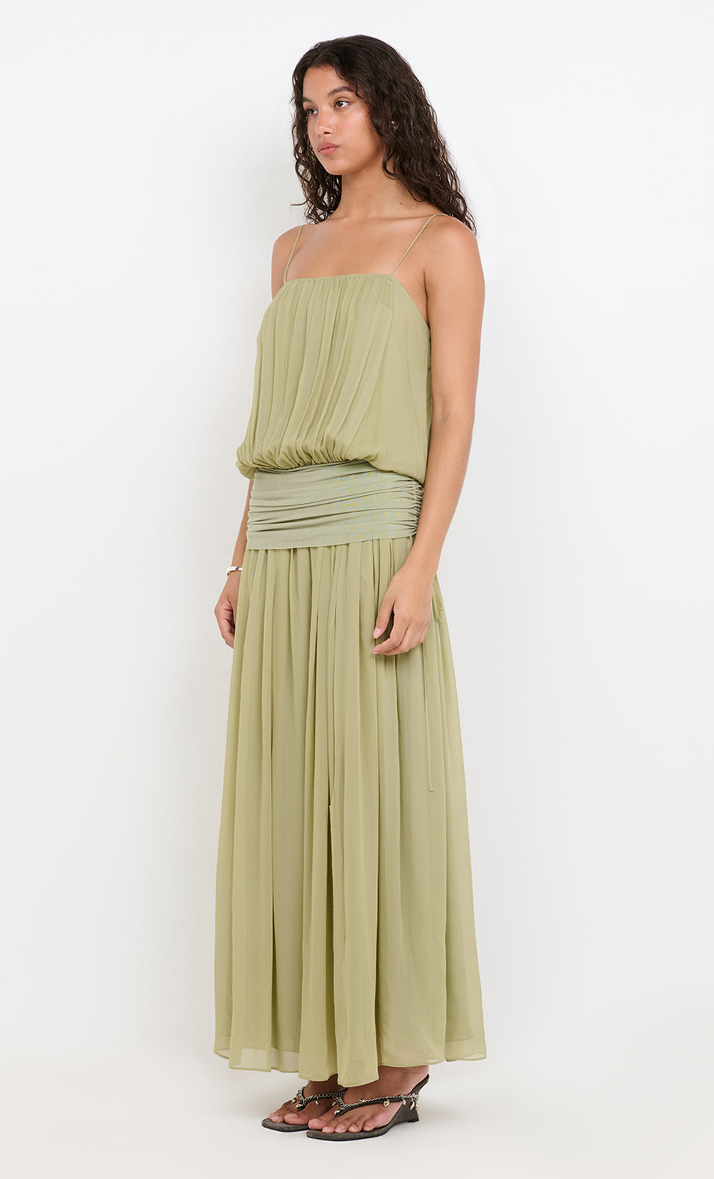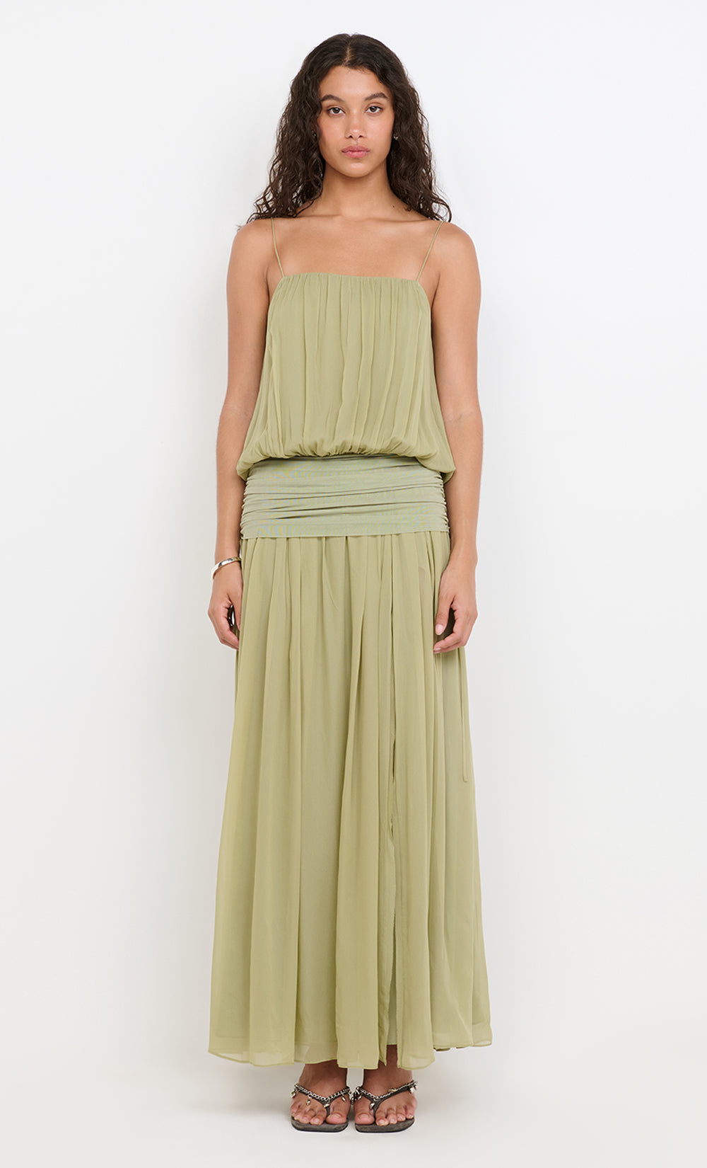 Flows into a gathered maxi dress