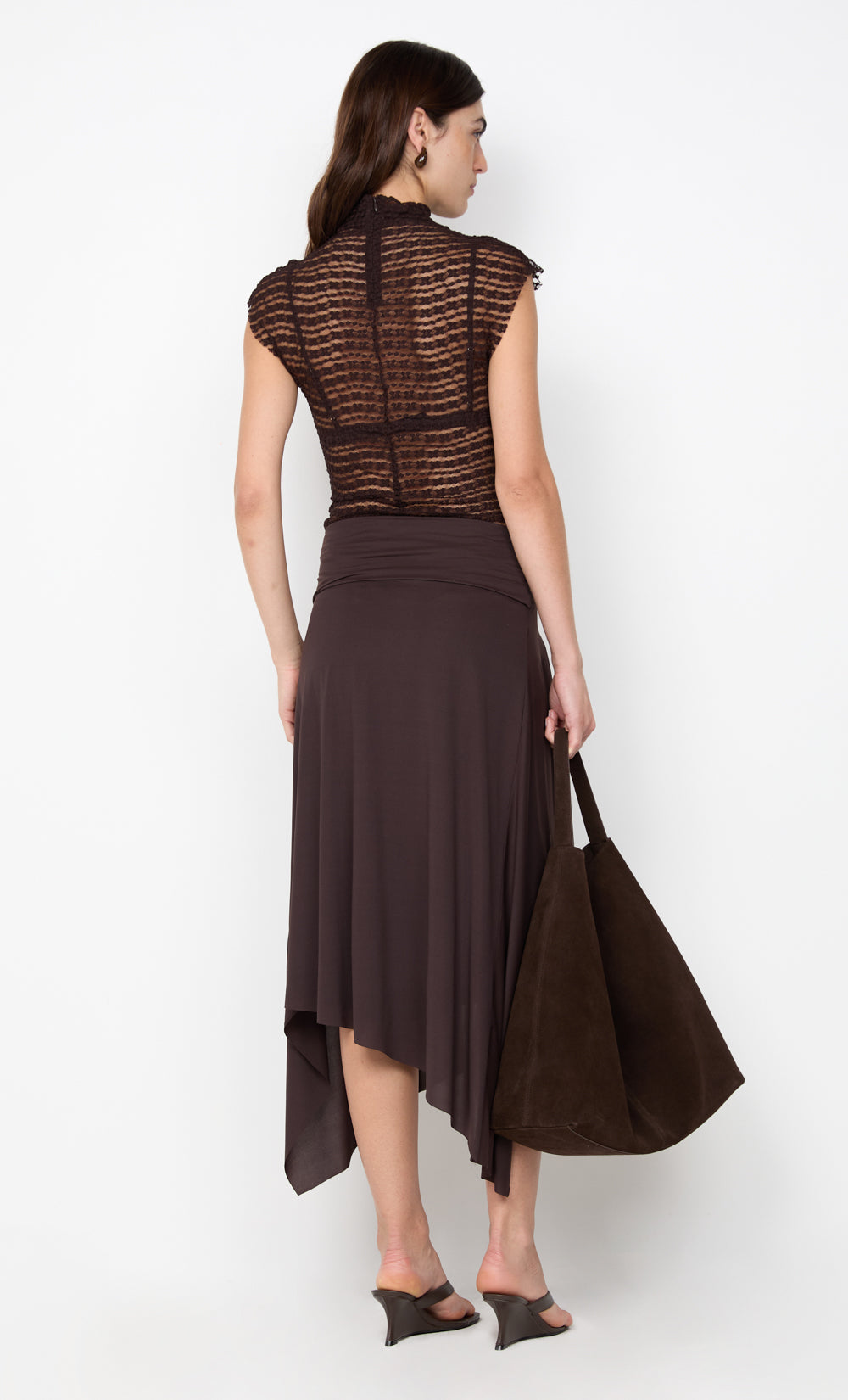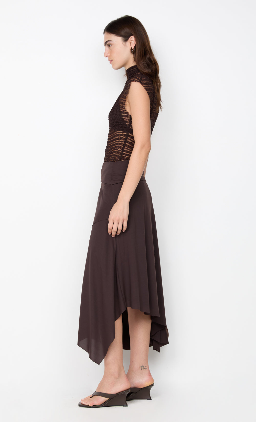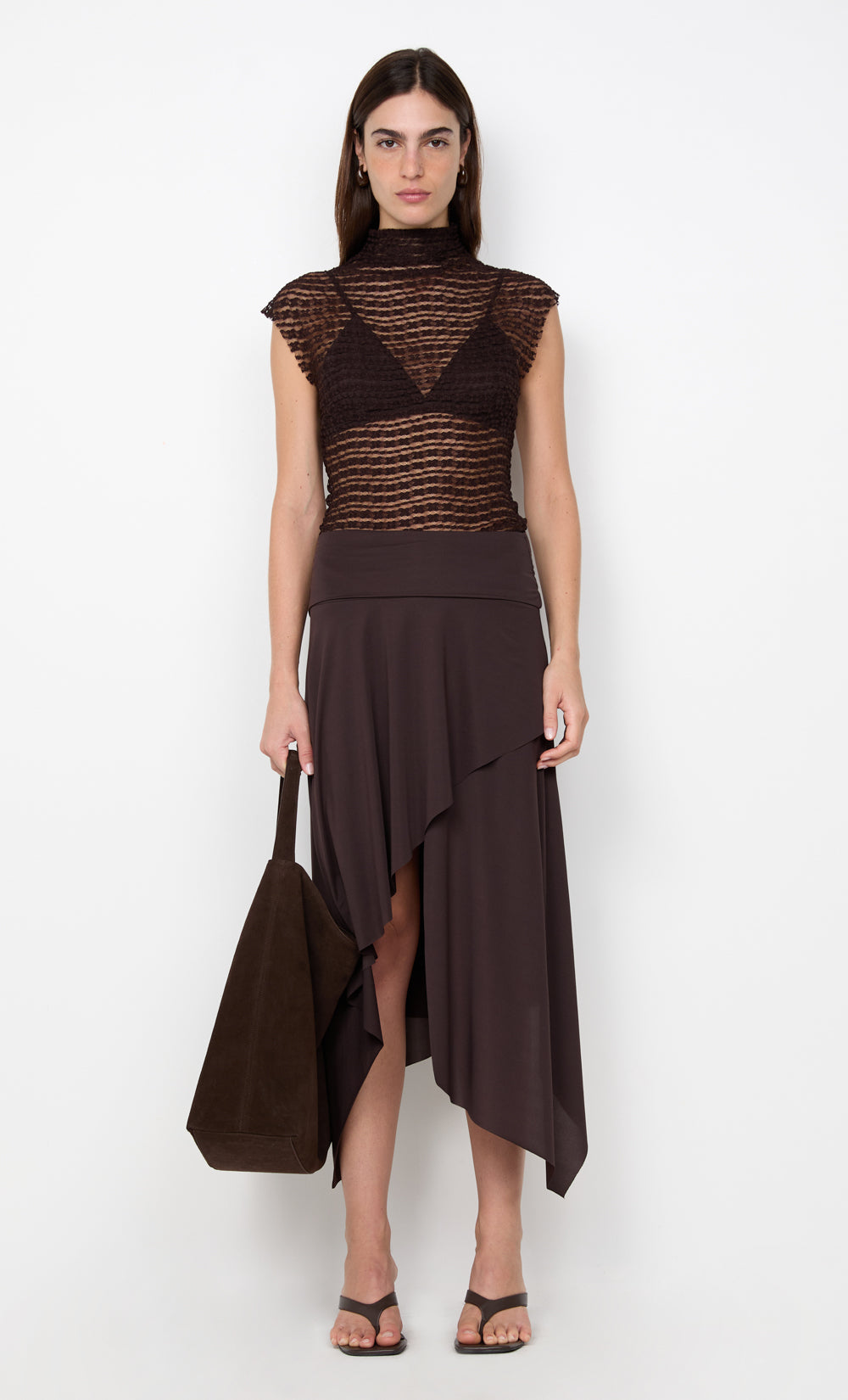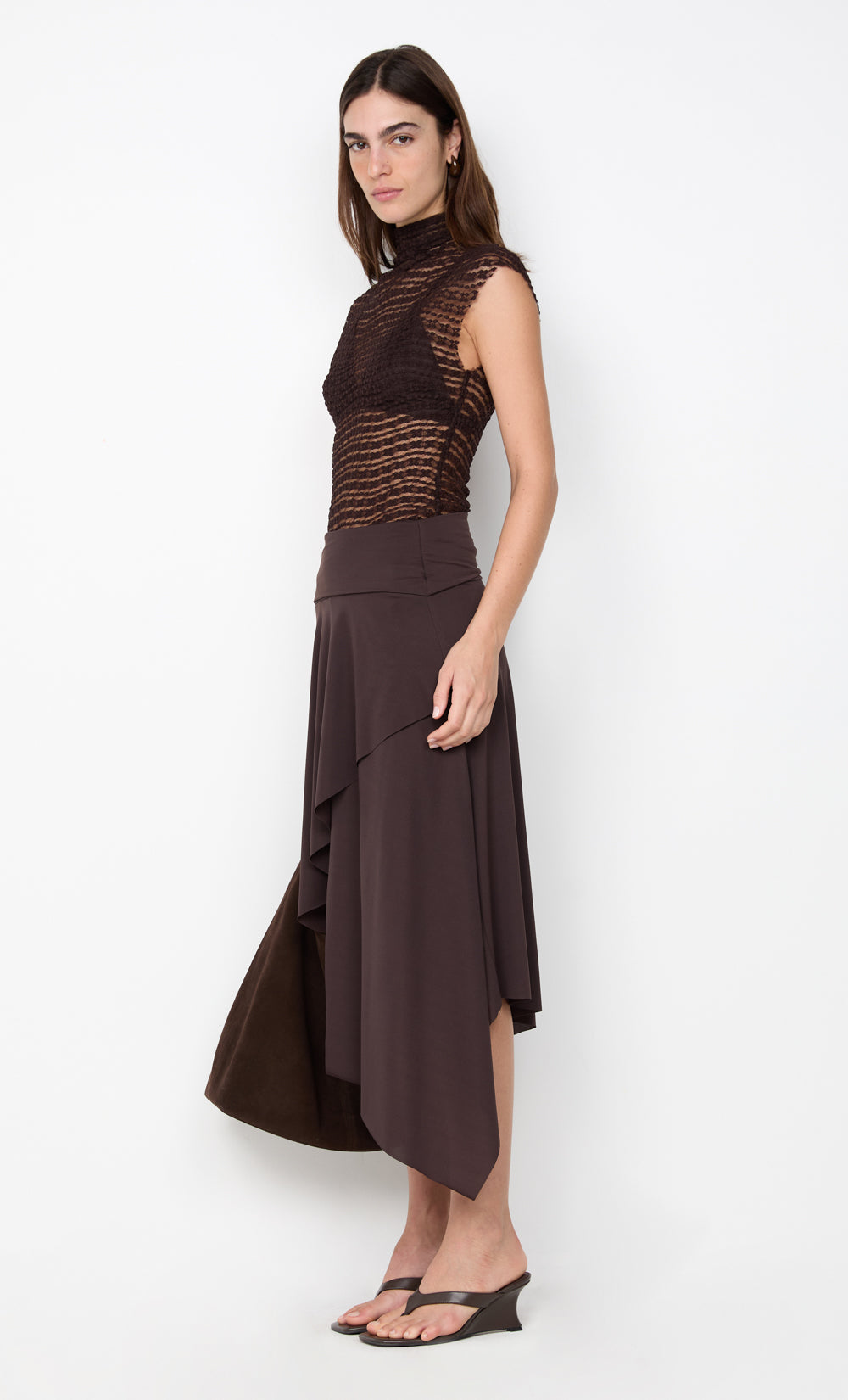 Emaretta Top in Dark Chocolate. This chic top, crafted from a textured stretch lace, features a sophisticated funnel neckline and a sheer design, perfect for a night out or elevated evening styling.