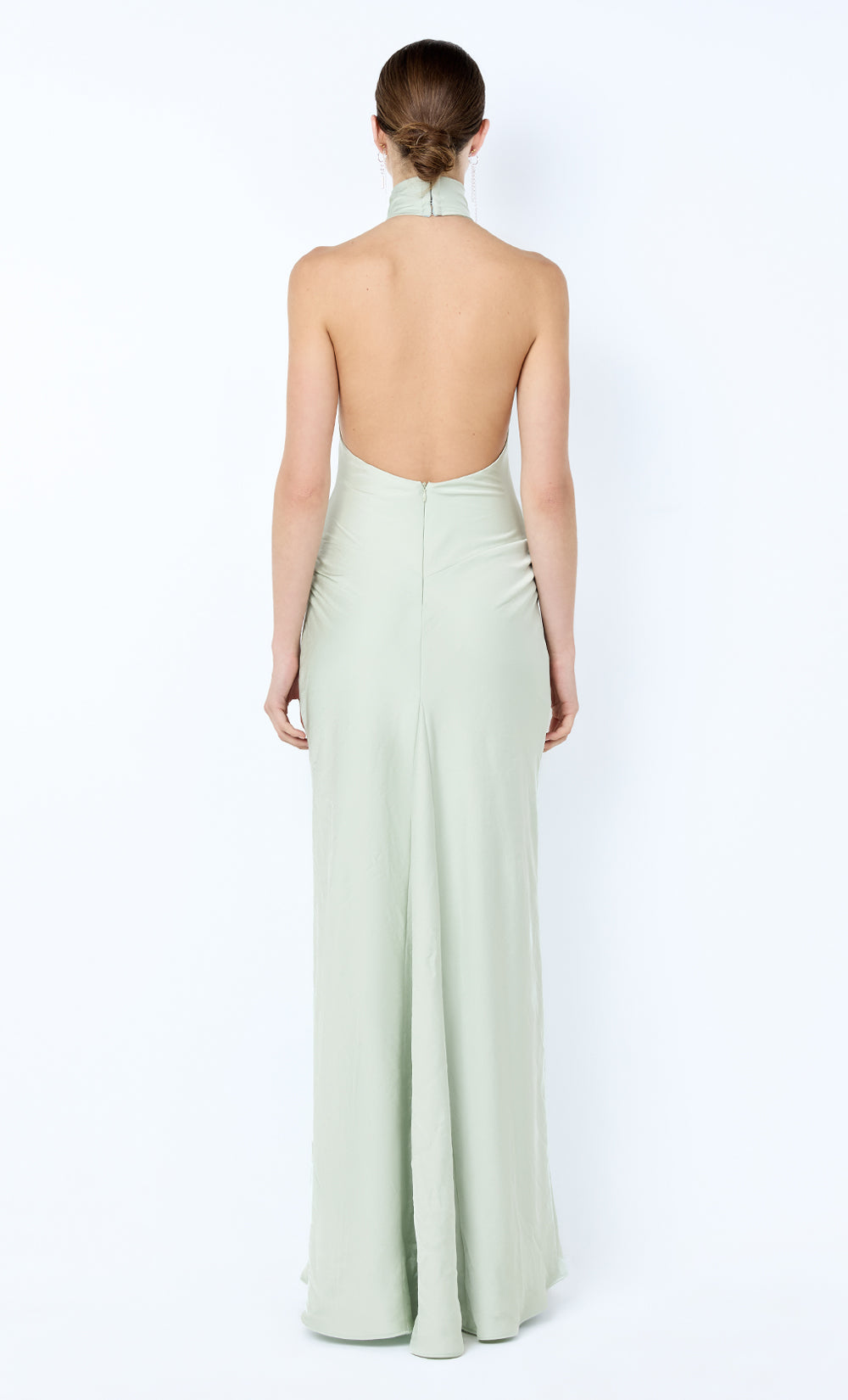 Lisette Halter Maxi Dress in Mint. An elegant maxi dress featuring delicate gathers and a flattering halter silhouette.