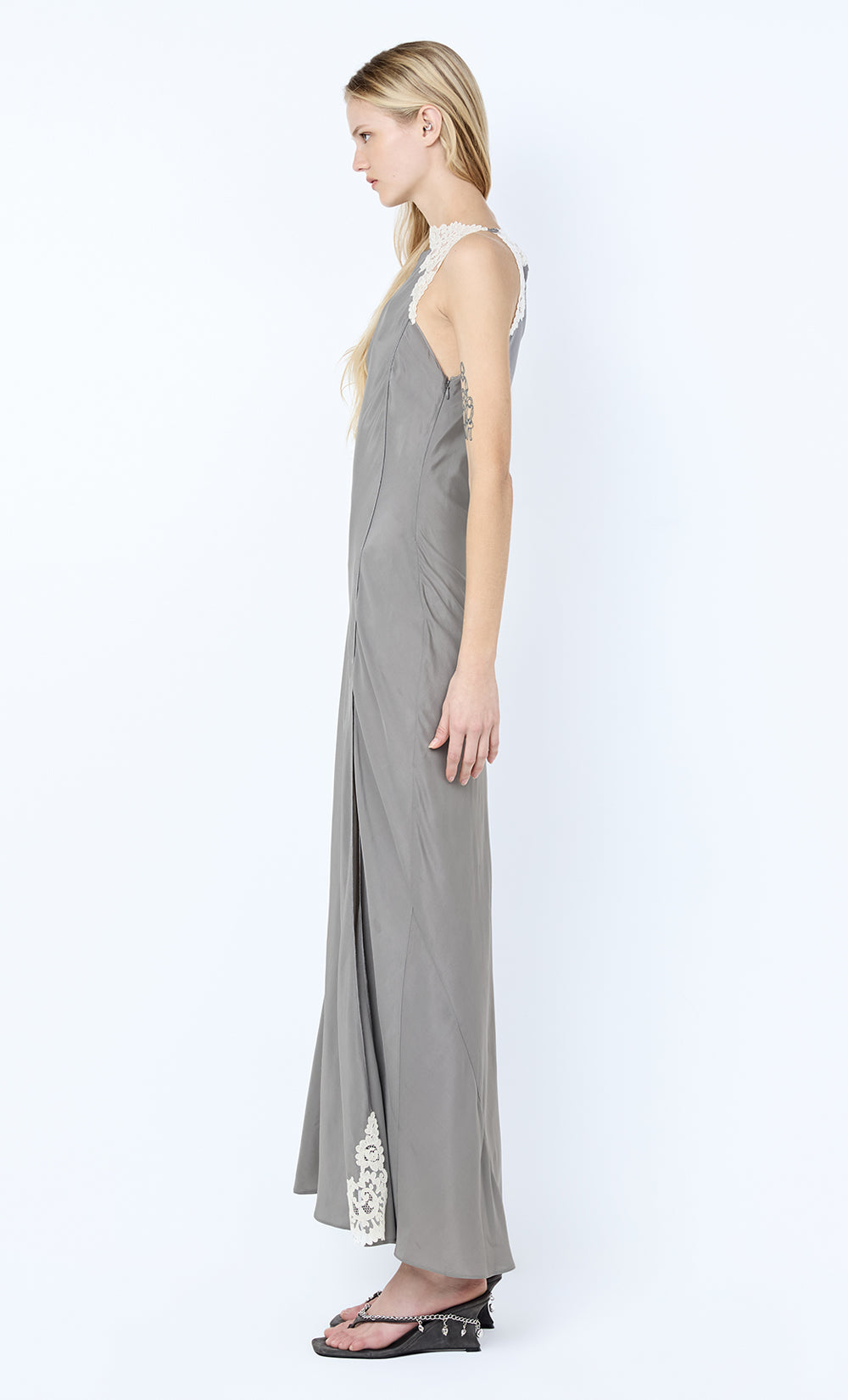 Chateau Split Maxi Dress in Slate Grey. A silk-viscose maxi dress, featuring lace detailing and an elegant front split, perfect for black tie events, a wedding guest dress, or evening styling.