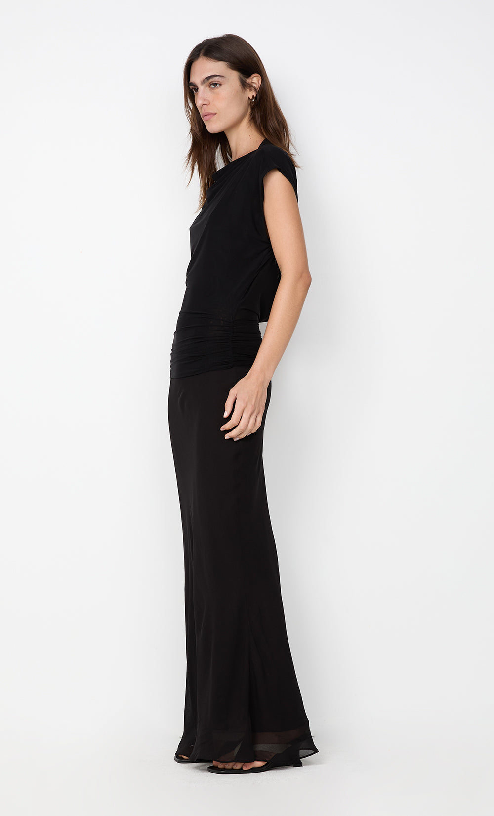 Jehnaya Asym Maxi Dress in Black. This elegant black maxi dress features a captivating back cutout, perfect for a night out or glamorous evening event.