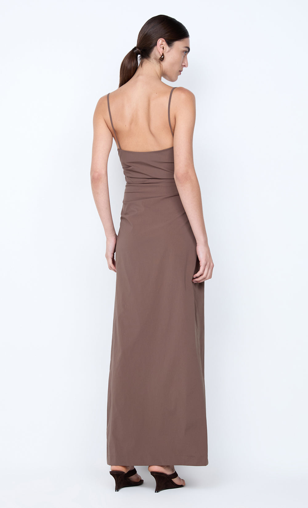 Lyana Asym Maxi Dress in Milk Chocolate. This stunning brown maxi dress, crafted from stretch nylon, features a flattering asymmetric neckline with a knotted shoulder strap and a front leg split, creating a sophisticated silhouette perfect for a night out or elevated holiday styling.