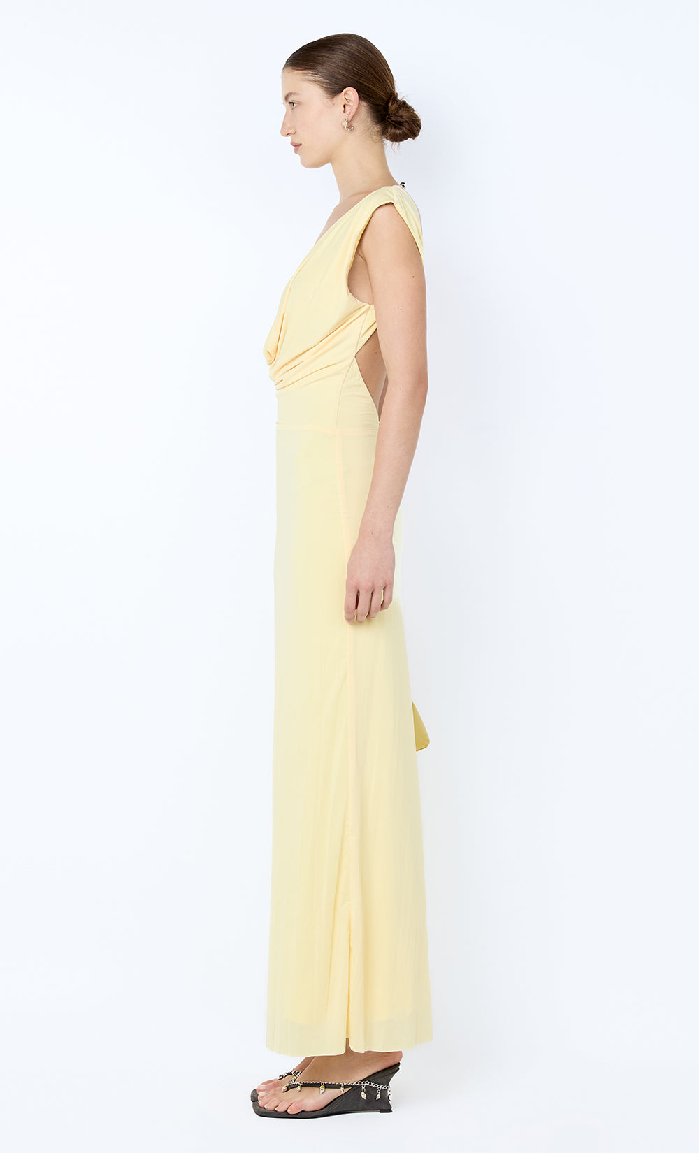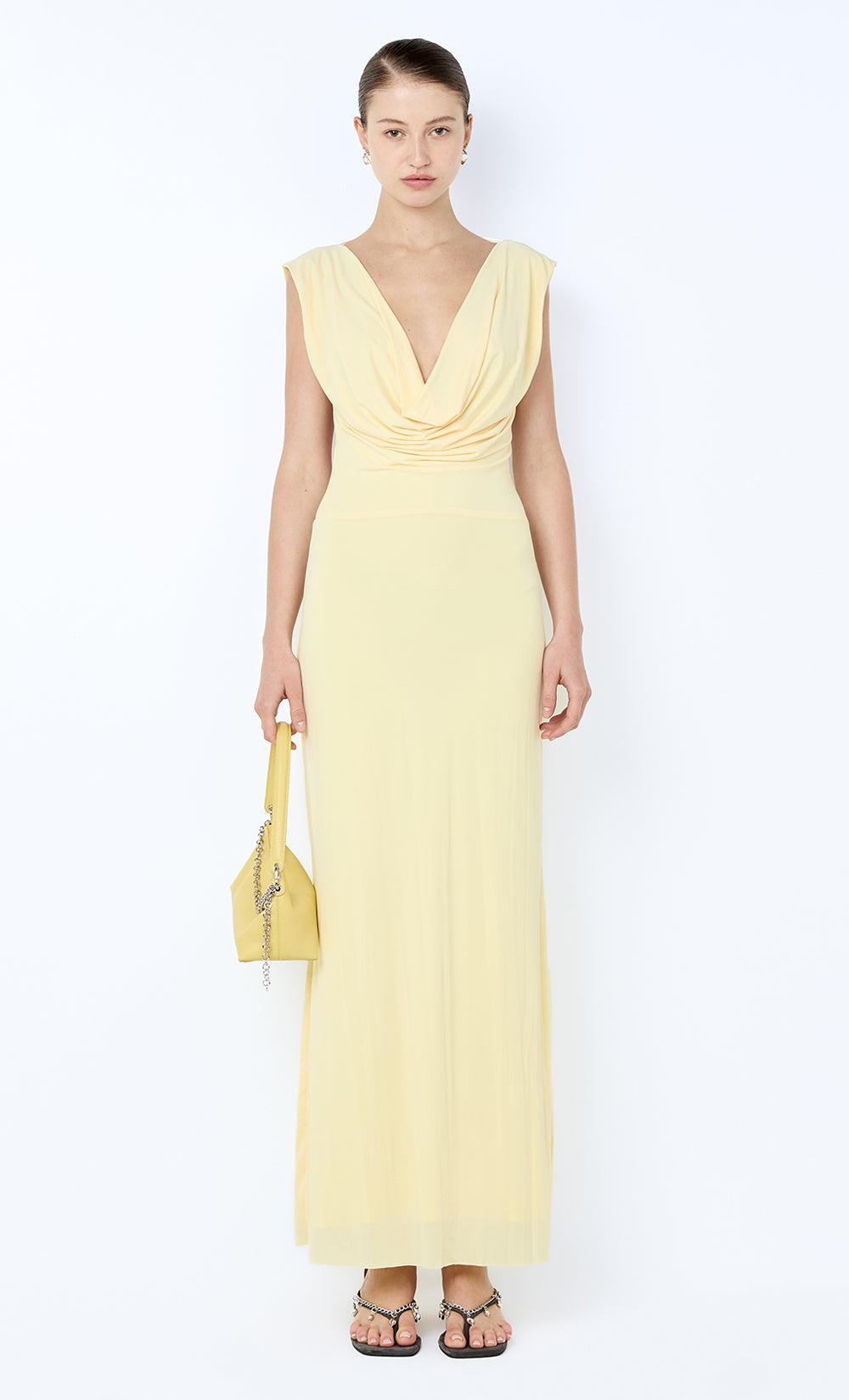 Brigitte Cowl Maxi Dress in Ice Yellow. An elegant, backless yellow maxi dress perfect for elevated daywear or evening styling.