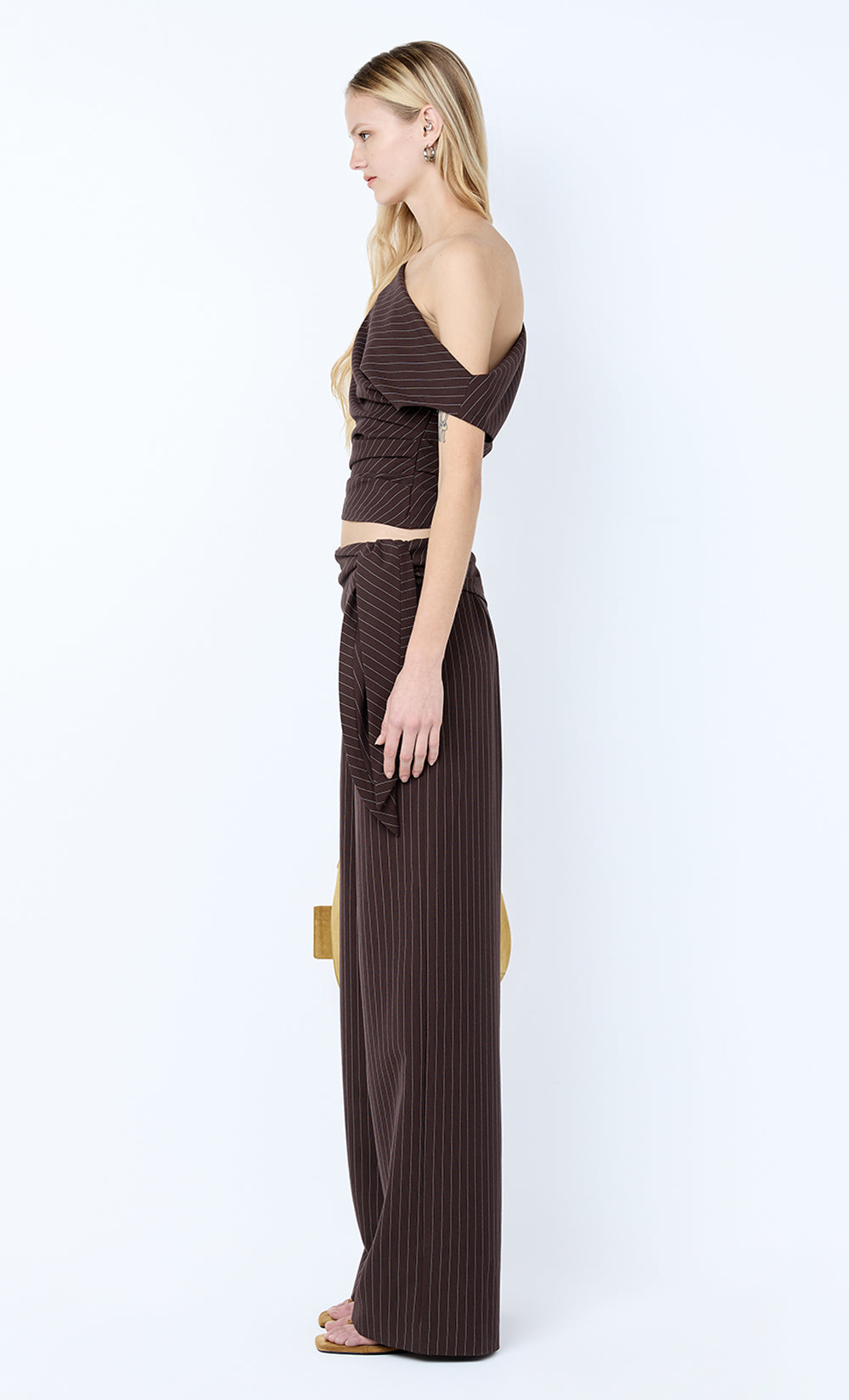 Andre Asym Top in Chocolate Pinstripe. A tailored, pinstripe top perfect for elevated daywear or evening styling.