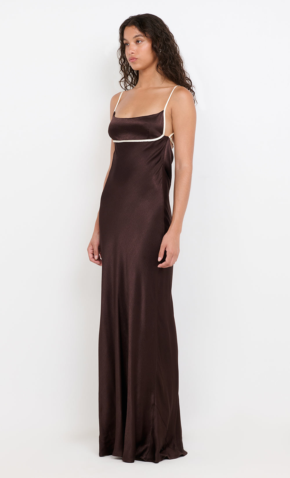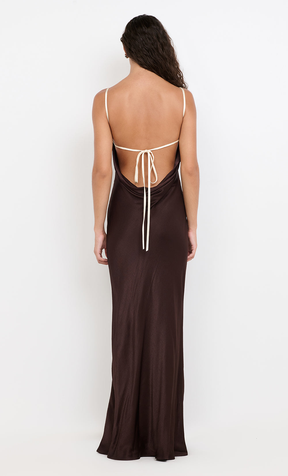 Marcy Cowl Maxi Dress in Dark Choc/Snow. An elegant maxi dress perfect for evening events, weddings or cocktail occasions.