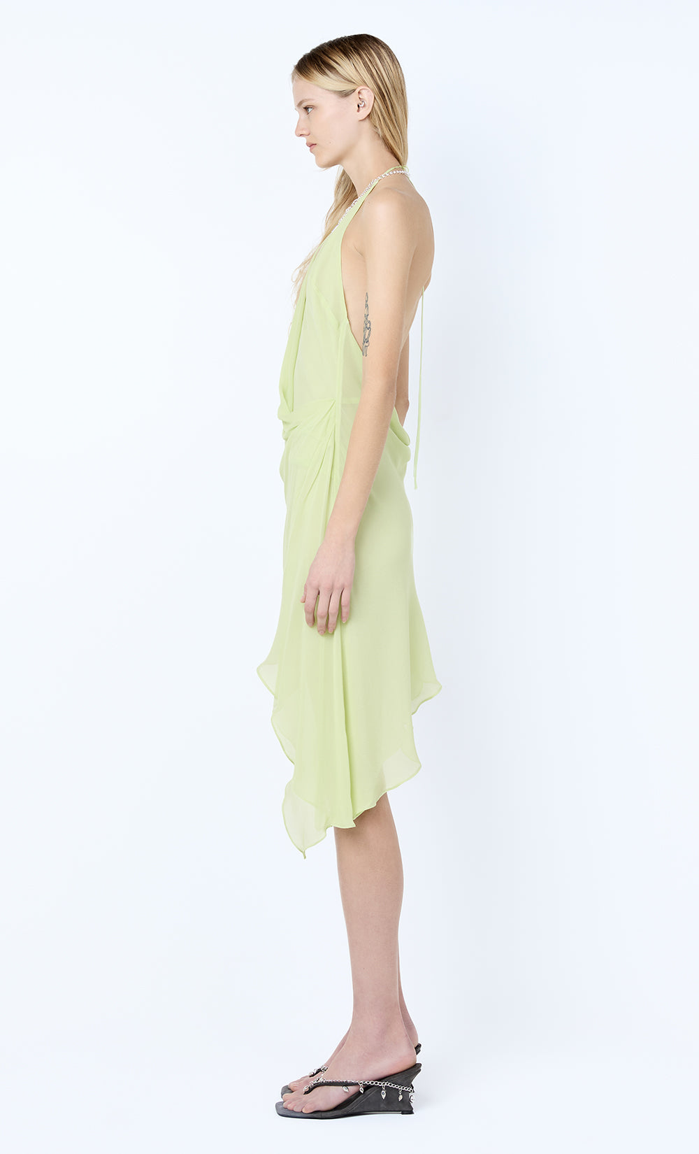 Sabrina Mini Dress in Wasabi. A vibrant georgette mini dress perfect for cocktail parties, summer weddings or evening events.