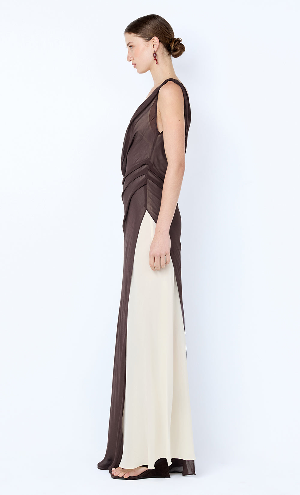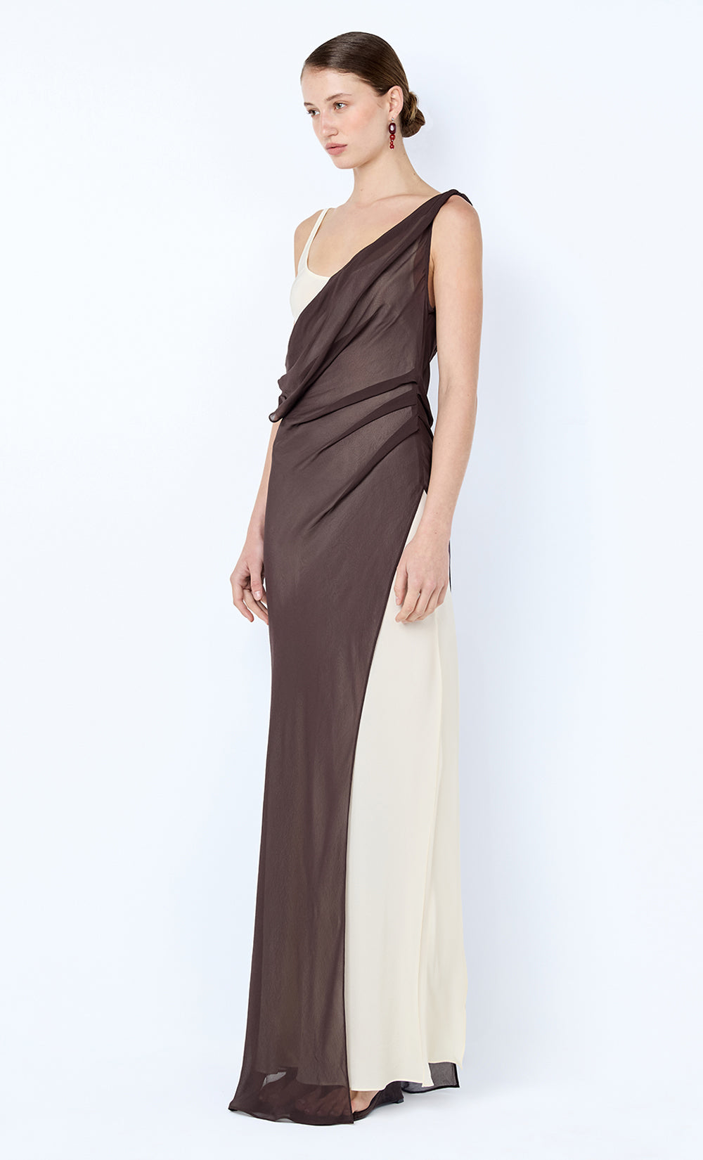 Augustin Asym Maxi Dress in Dark Chocolate. A layered dress perfect for elevated daywear or evening styling.