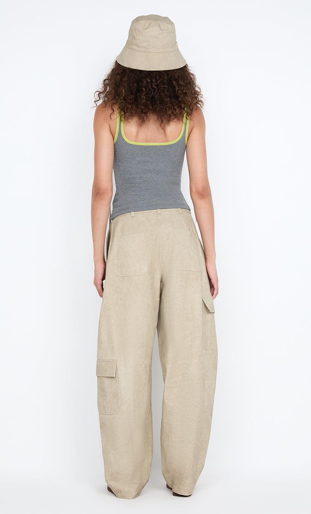 Sia Utility Pant in Taupe. These effortless utility pants, crafted from a heavy-weight cotton drill, offer a comfortable straight-leg fit and a clean, modern aesthetic perfect for casual holiday styling or elevated day-to-night looks.