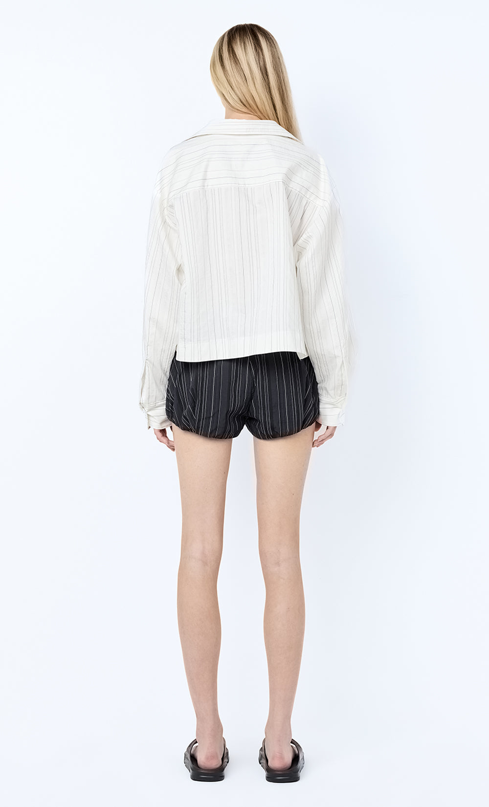 Romi Shirt in Ivory/Black Stripe. A relaxed striped shirt in a cotton-tencel blend, cut to a clean cropped length. Finished with a patch pocket, button closure, and side-seam splits. An easy piece for everyday styling.