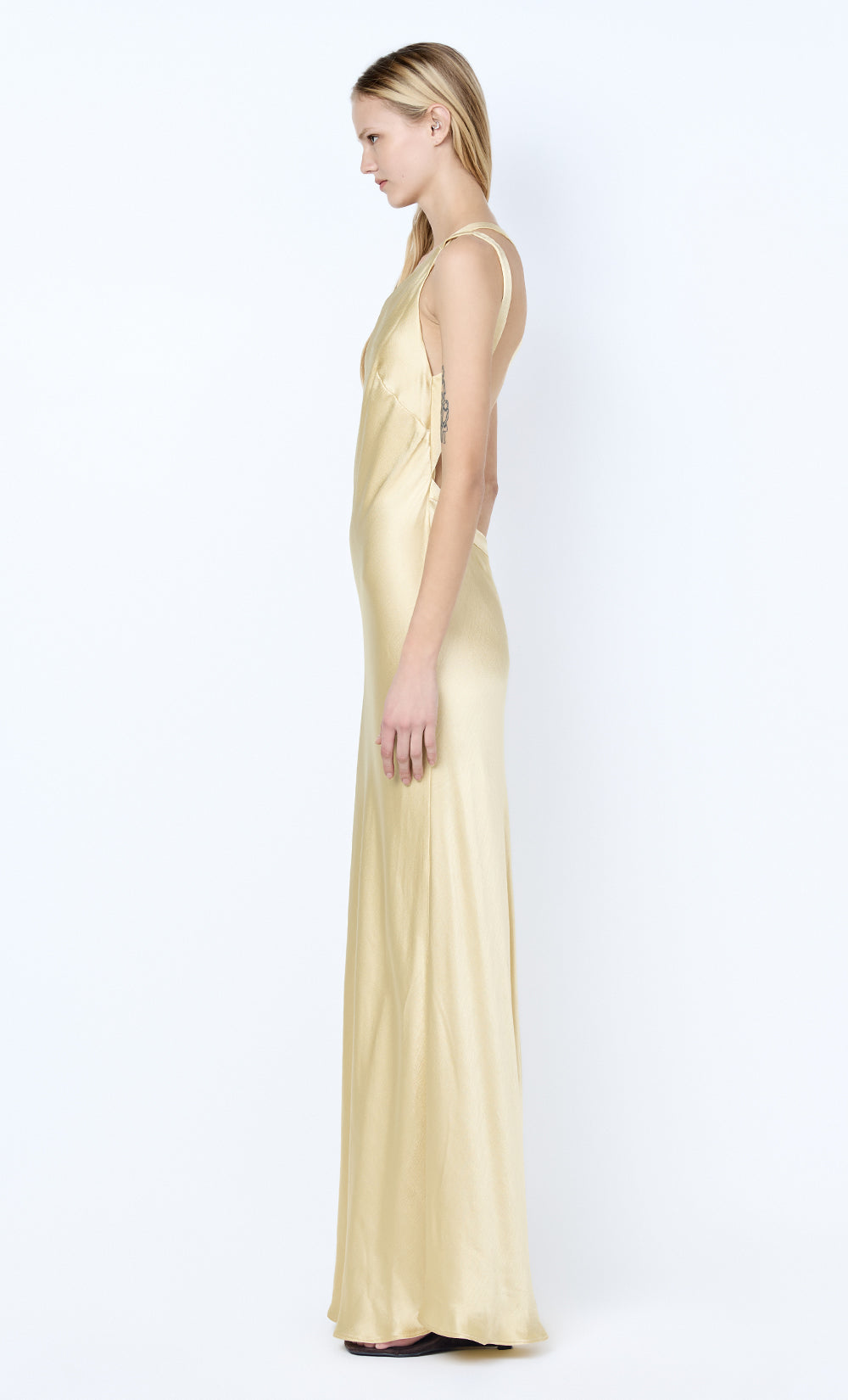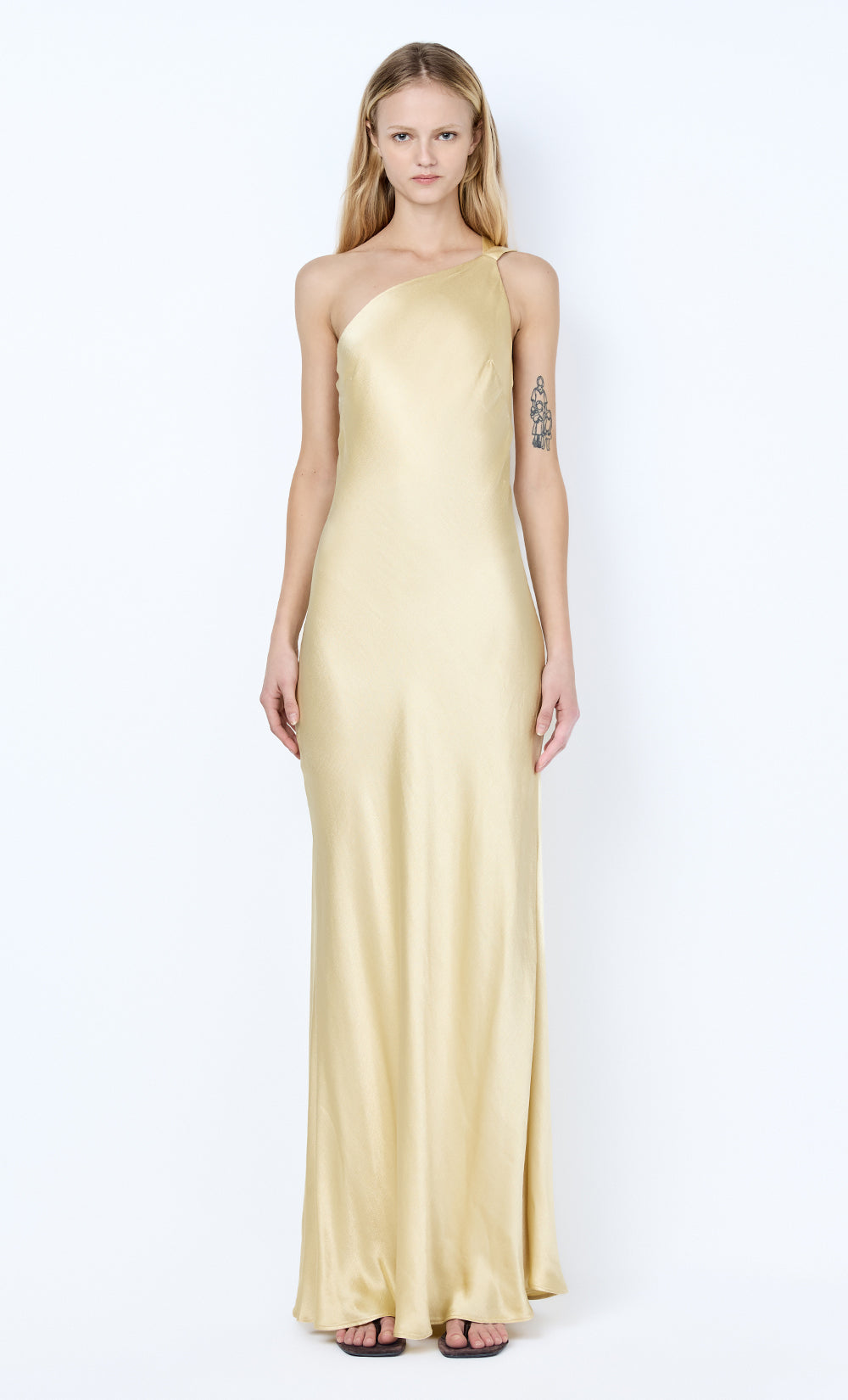 Gia Asym Maxi Dress in Wheat. This elegant bias-cut maxi dress features a flattering asymmetric neckline and a striking open back, creating a sophisticated silhouette perfect for a luxurious evening or holiday event.