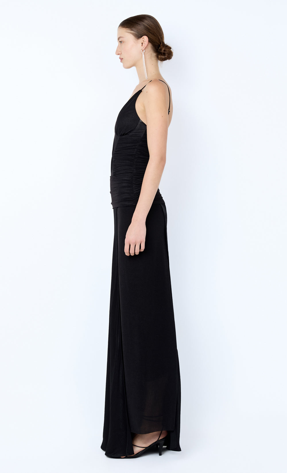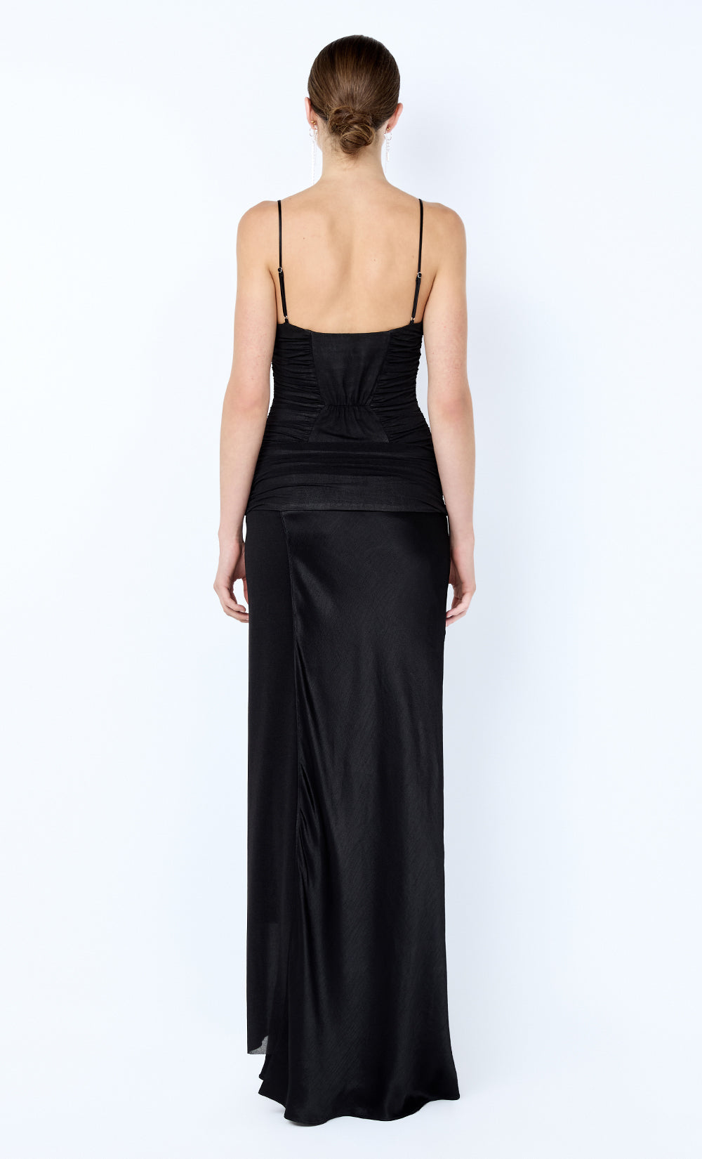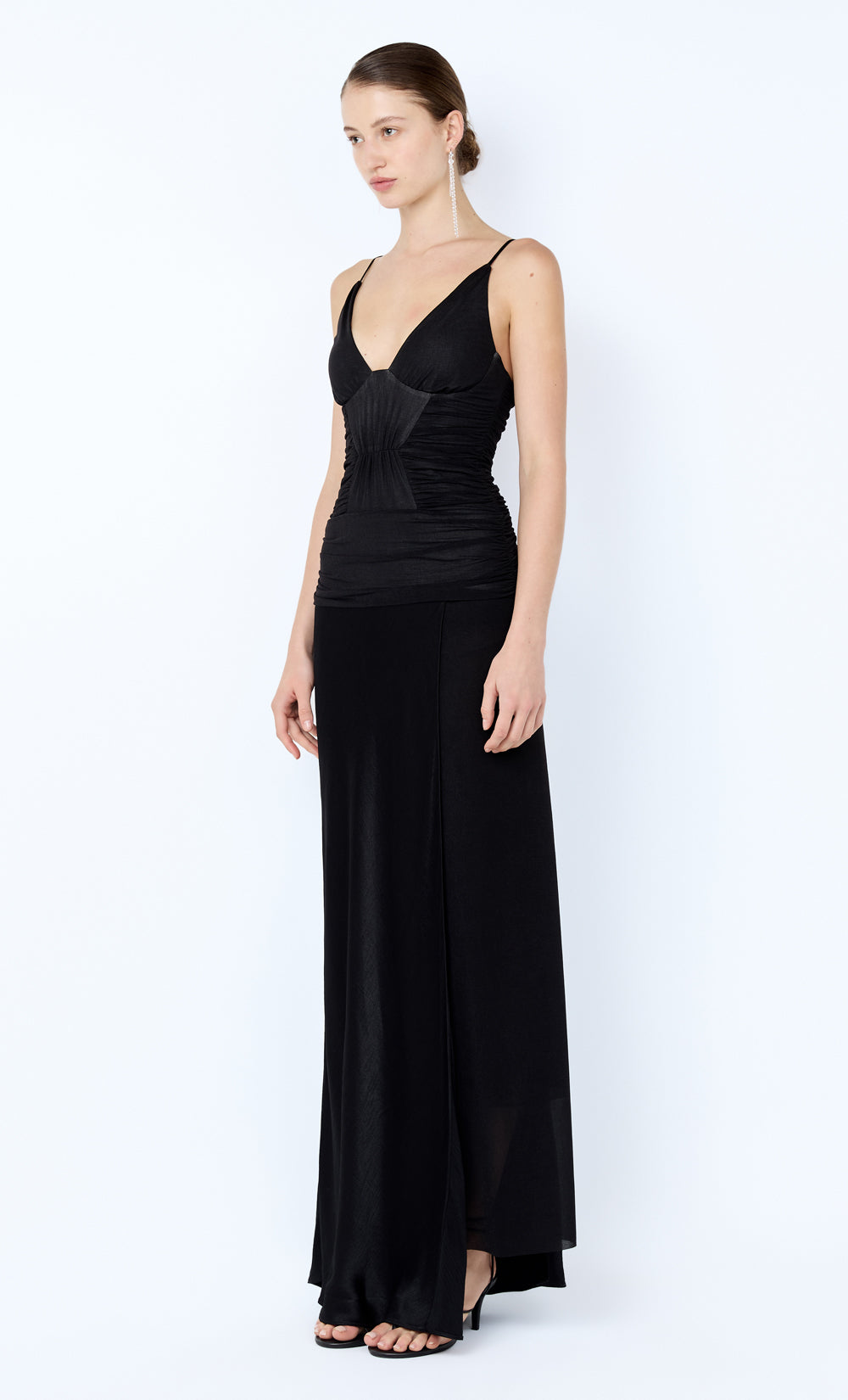 Airlie Maxi Dress in Black. A lightweight stretch-stocking maxi dress with a gathered, panelled bodice that shapes the fit. Finished with a gathered yoke flowing into a contrast bias-cut skirt for an elevated event look.