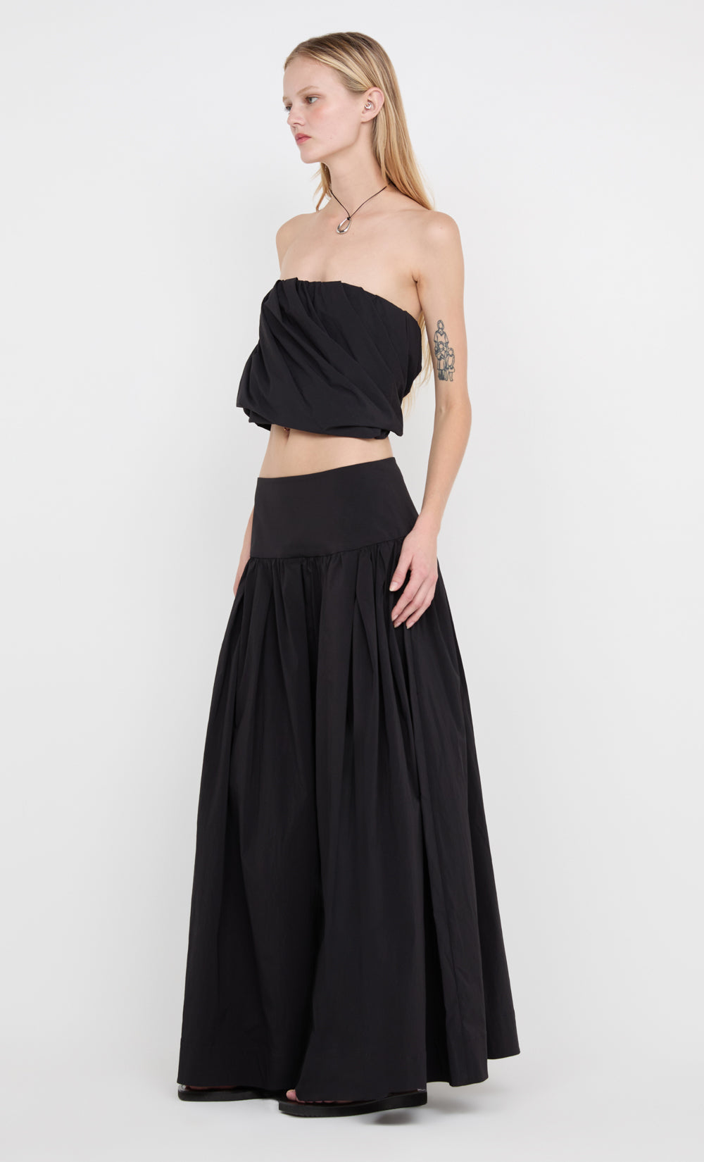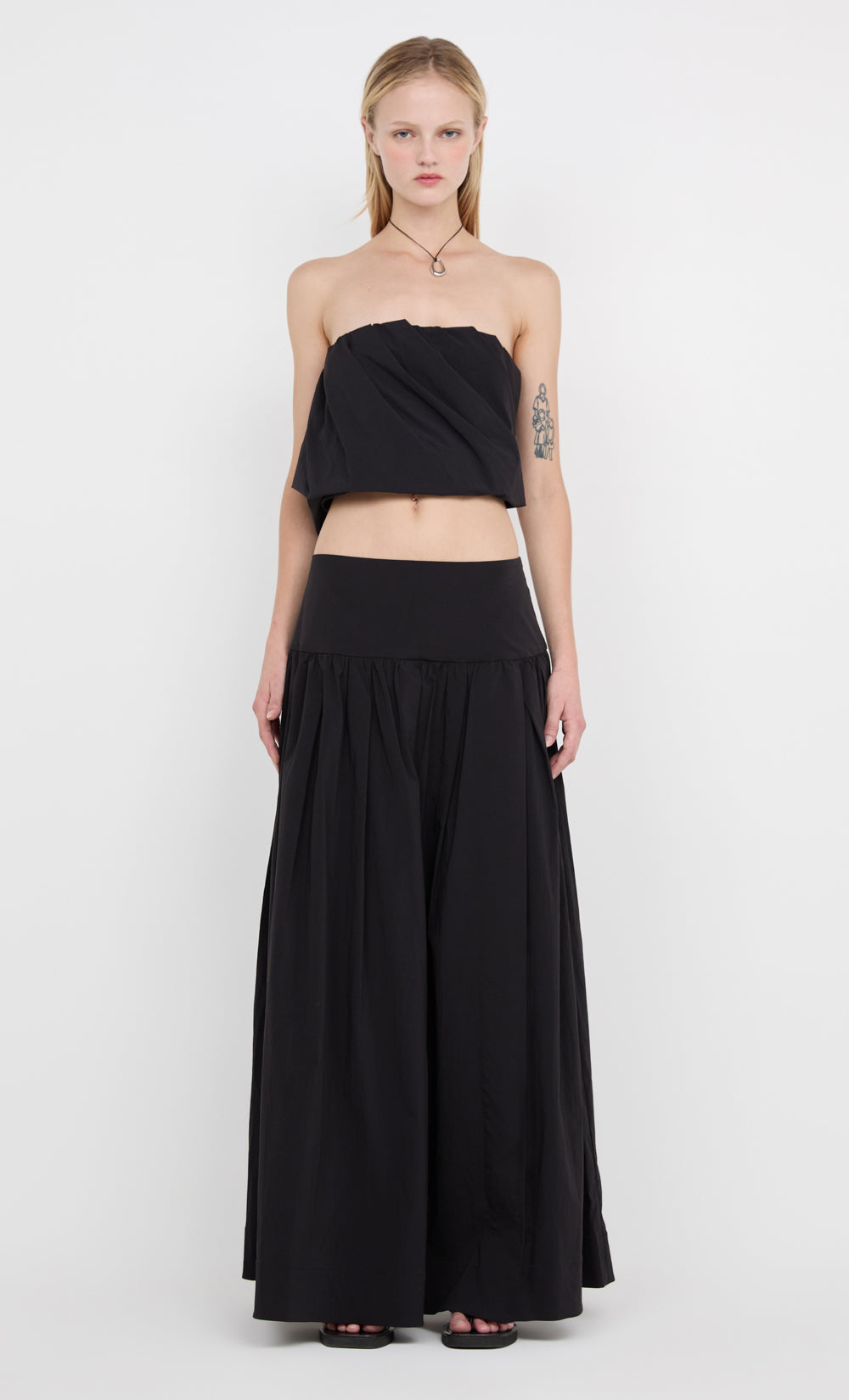 This elegant maxi skirt, crafted from stretch nylon, features a flattering wide waist yoke panel, offering a sophisticated silhouette perfect for a stylish night out or special event