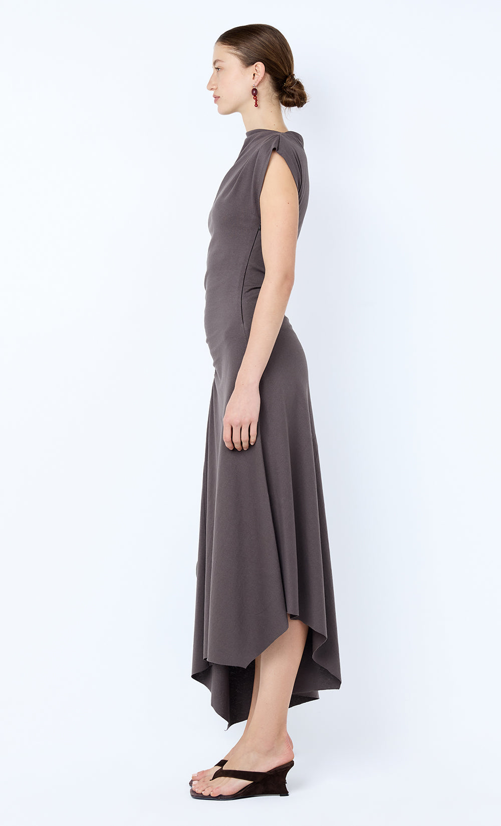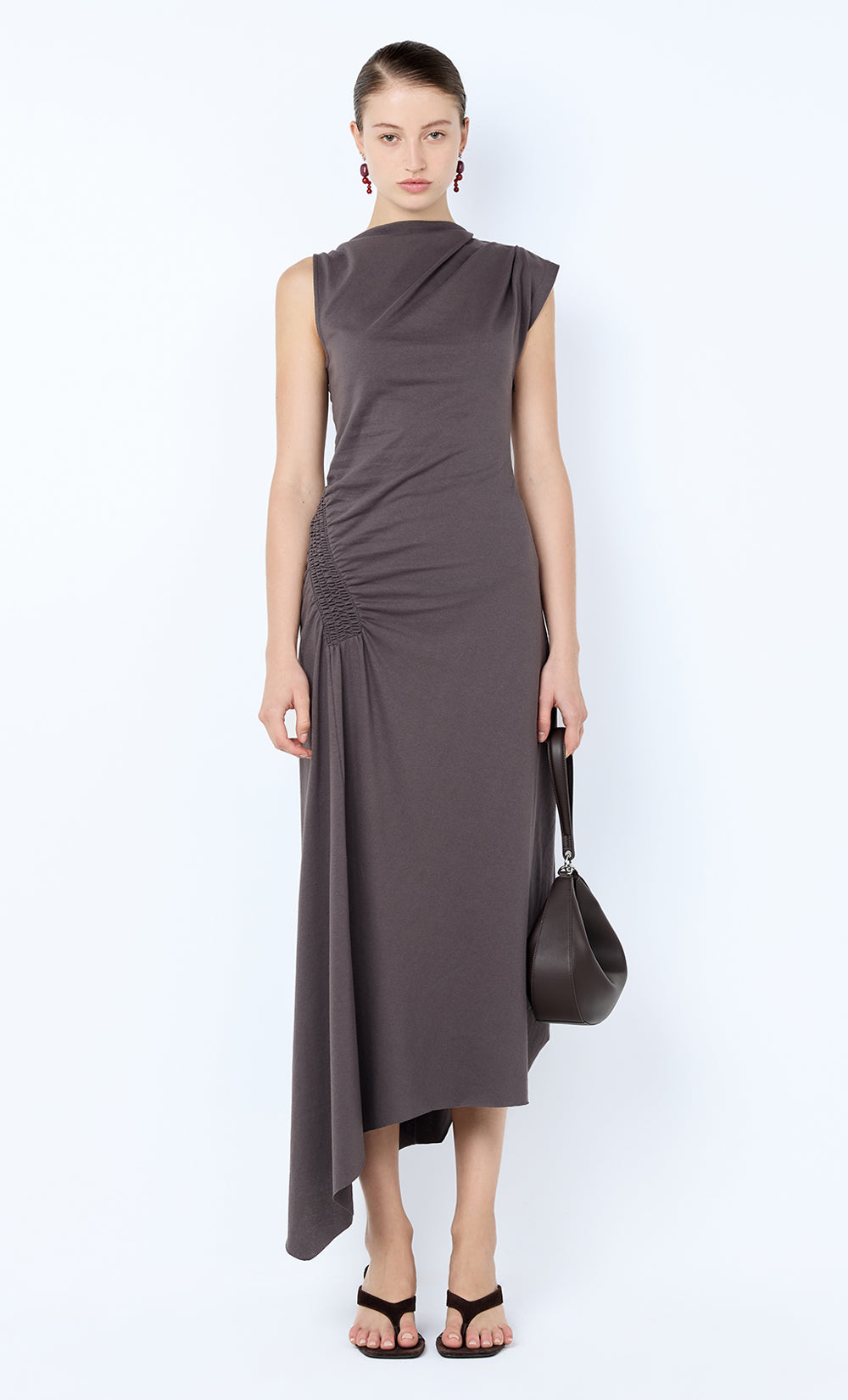 Ema Asym Dress in Washed Chocolate. An elevated jersey midi dress designed for effortless day-to-night wear.