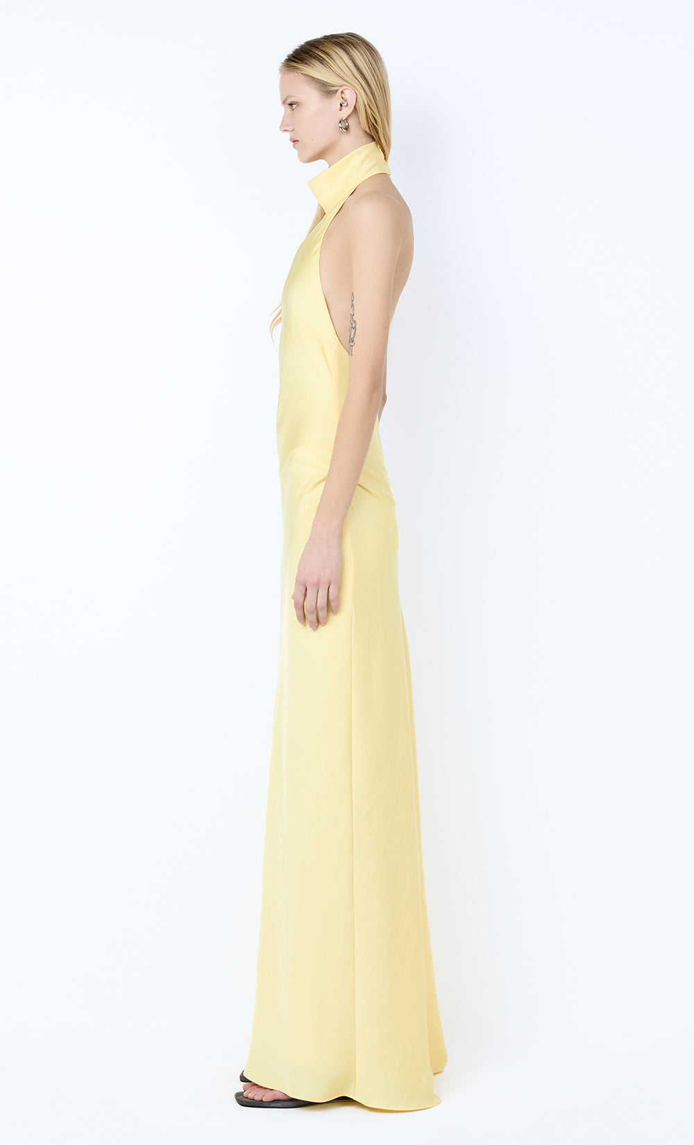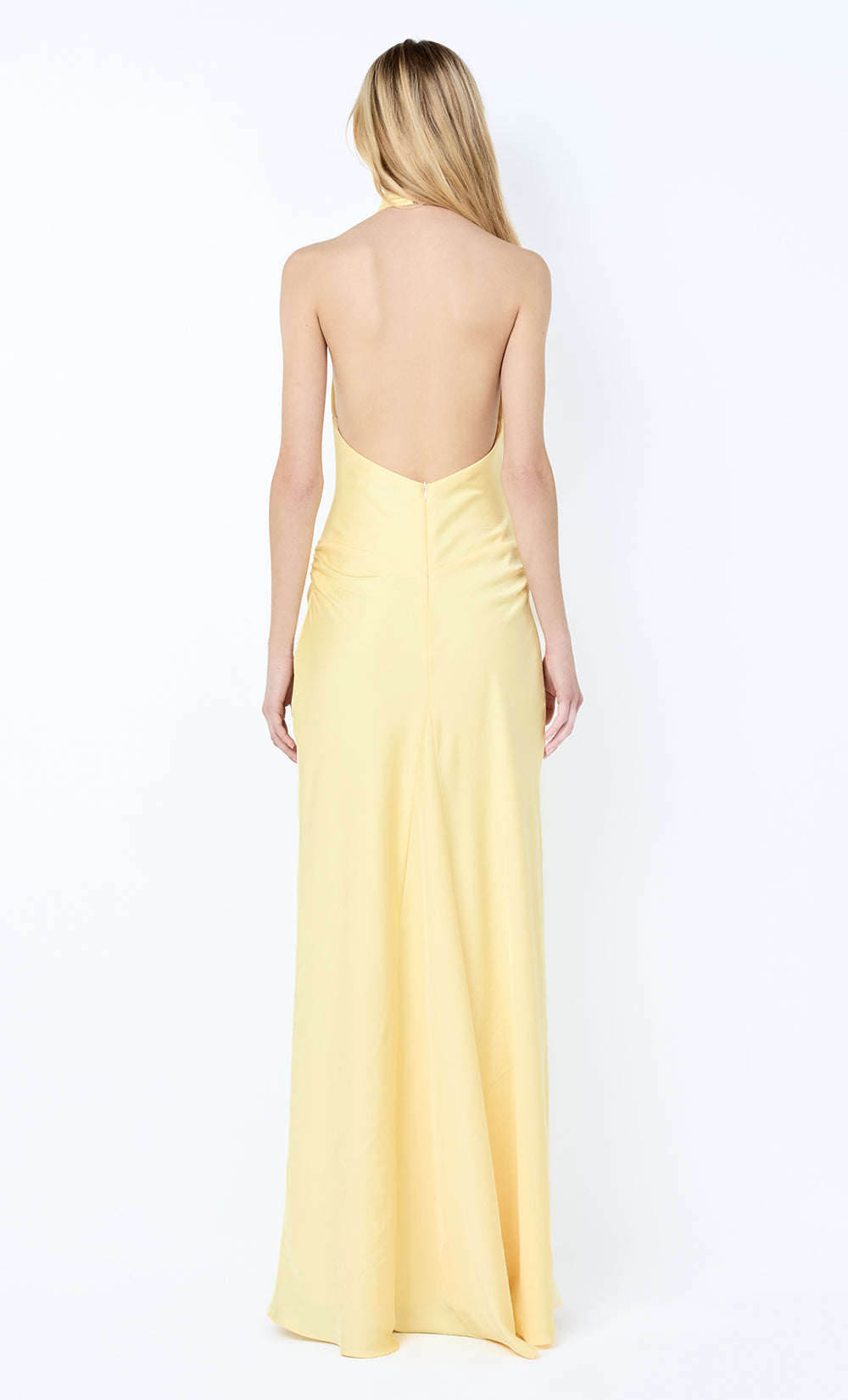 Lisette Halter Maxi Dress in Citron. A signature yellow maxi dress with a high neck, and flattering backless design, perfect for formal events or evening occasions.