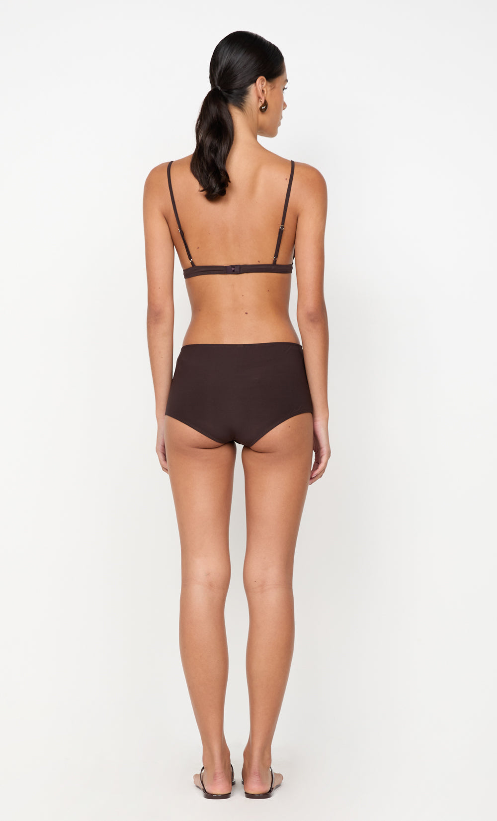 Moda Bra in Dark Chocolate. This versatile triangle bra, crafted from stretch fabrication, features adjustable straps and a bra clasp at the back for a perfect fit, making it a great layering piece for resort styling.