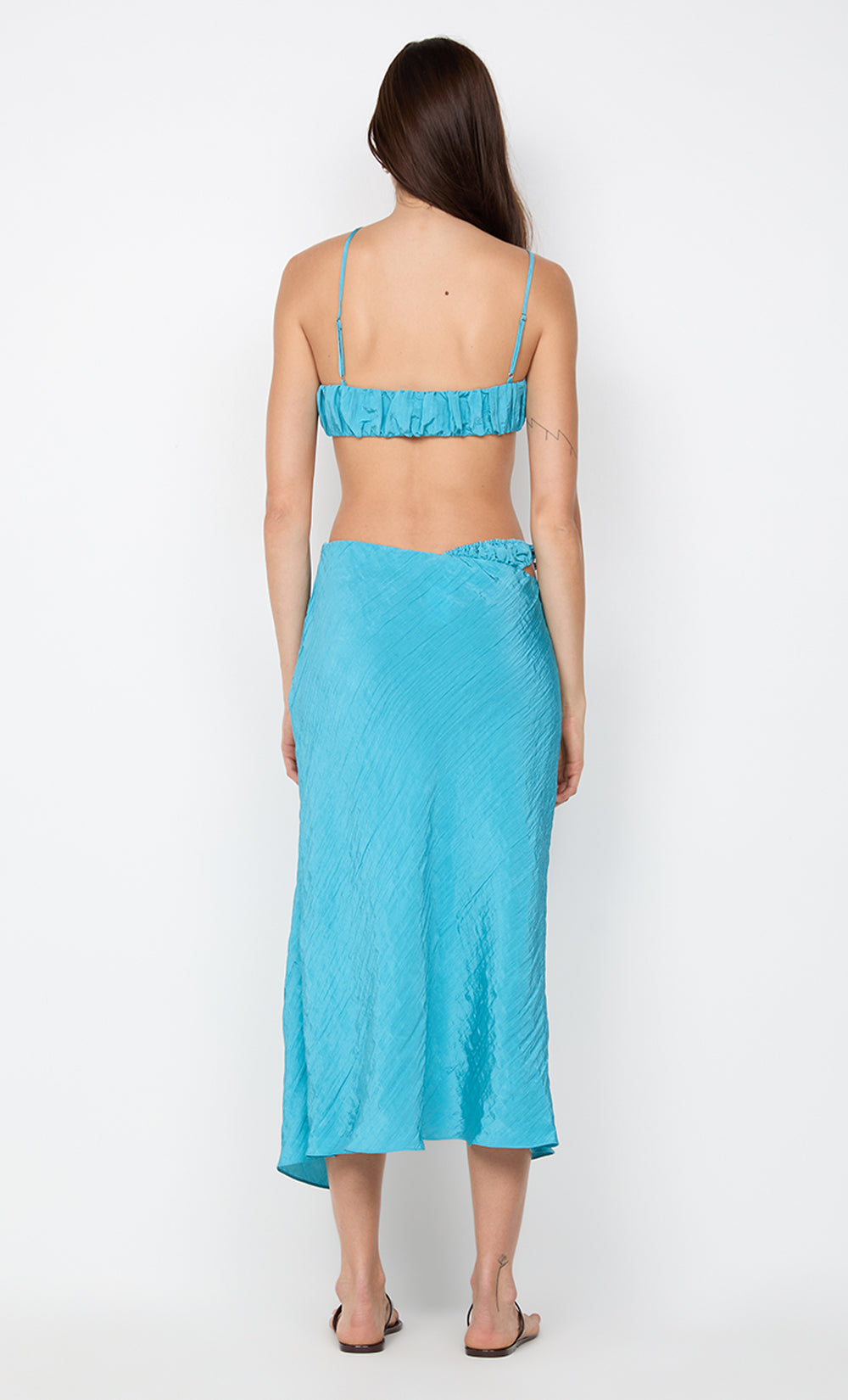 Odessa Split Midi Skirt in Deep Sea. This chic midi skirt, crafted from a crinkle fabrication, features a flattering twist detail with a front slit and a unique beaded undergarment, perfect for a night out or glamorous resort styling.