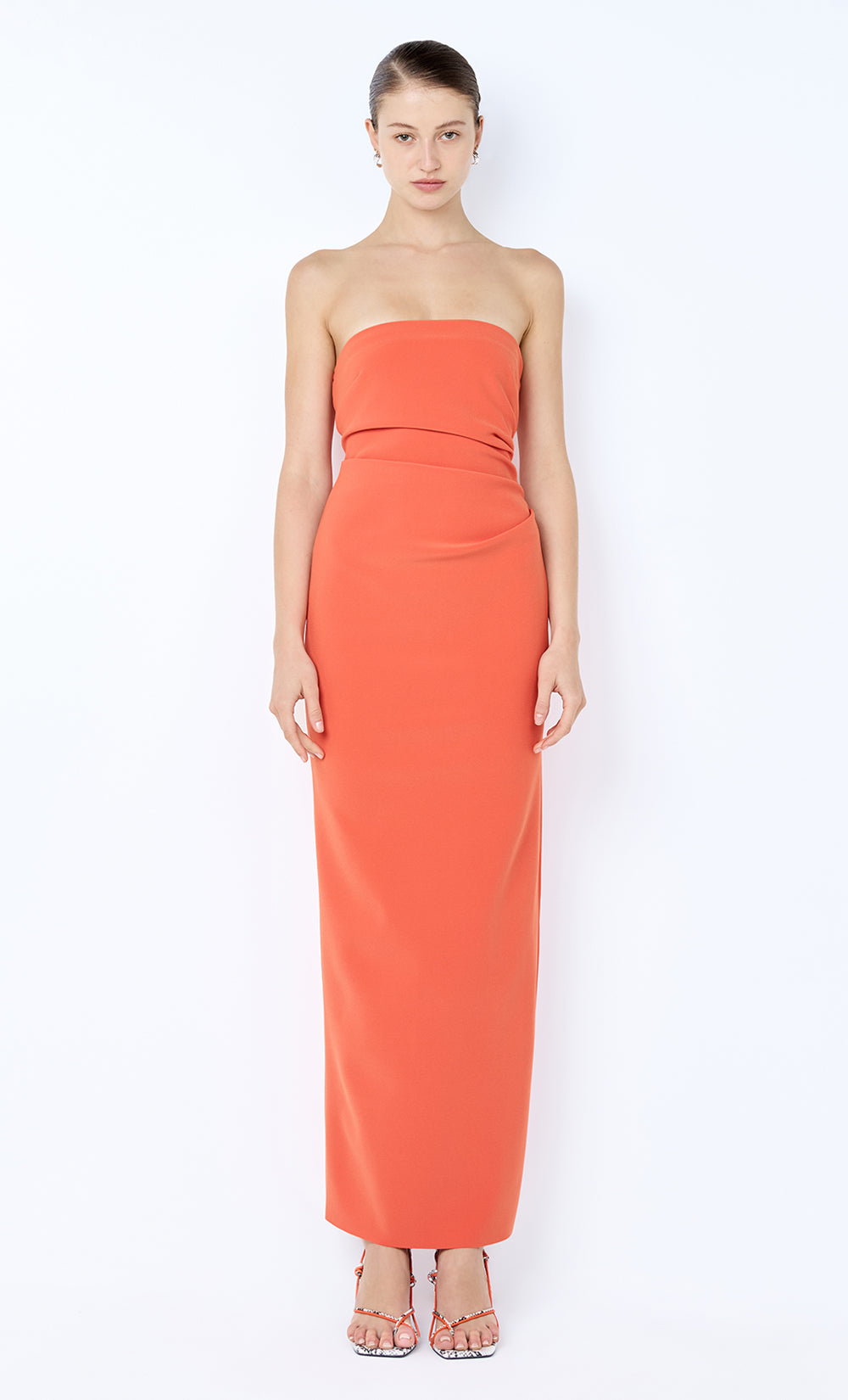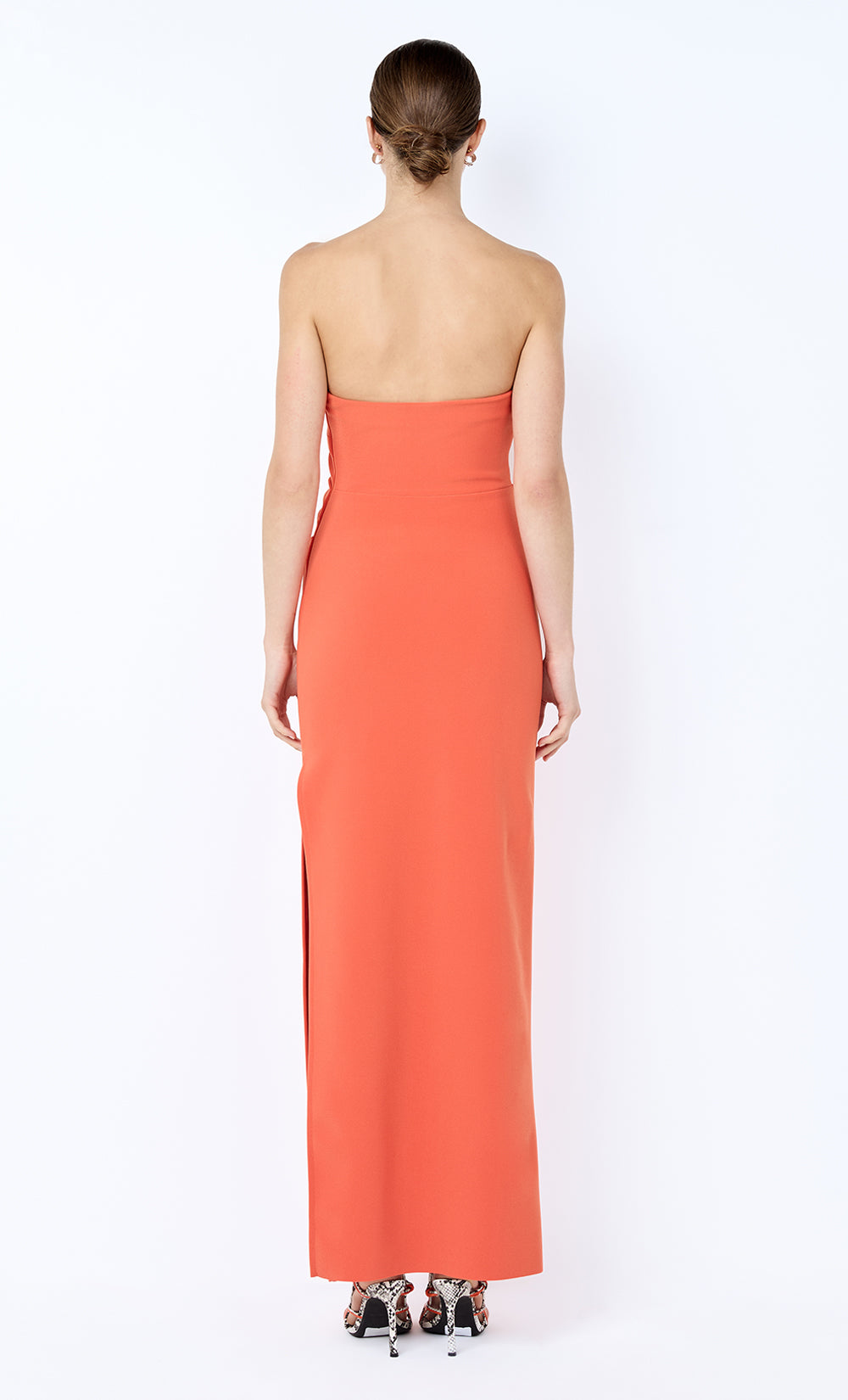 Reina Strapless Maxi Dress in Orange. A structured strapless dress cut from bonded crepe,ideal for formal events, summer celebrations, or elevated evenings out.