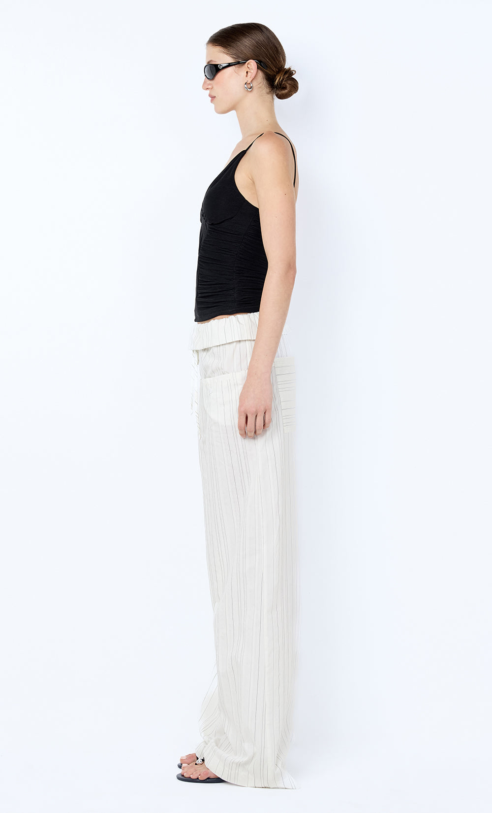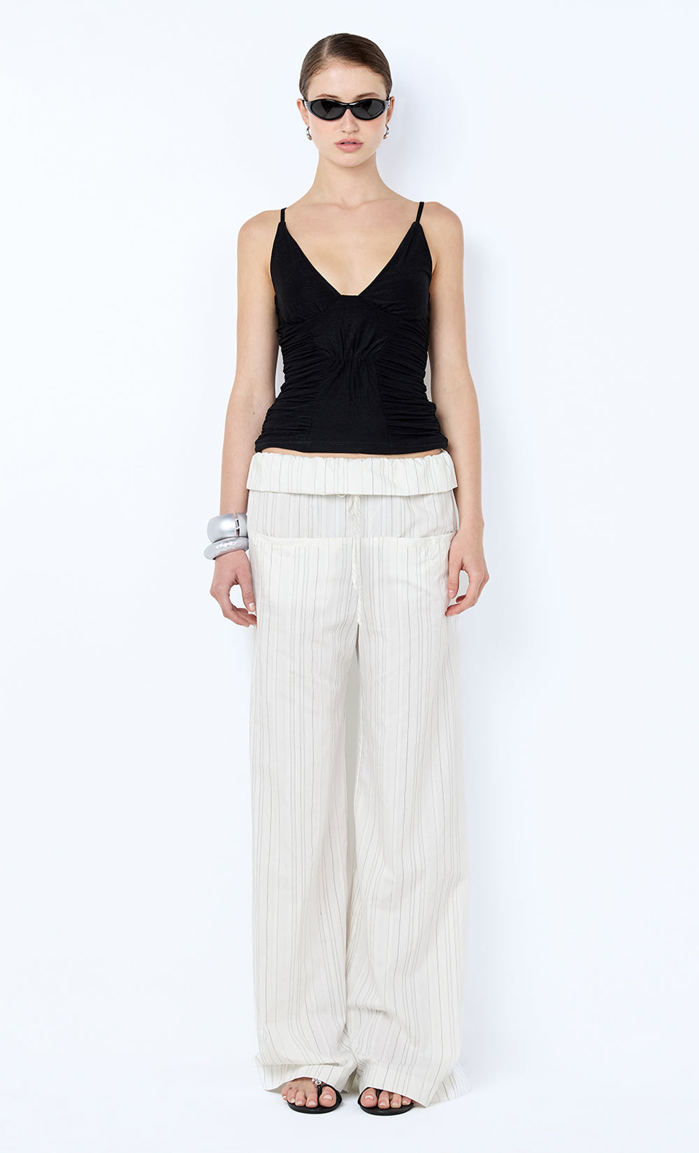 Romi Pant in Ivory/Black Stripe. A striped cotton-tencel pant with a clean straight leg and a relaxed, elevated feel. A polished everyday option styled with tees, shirting, or the matching Romi pieces.