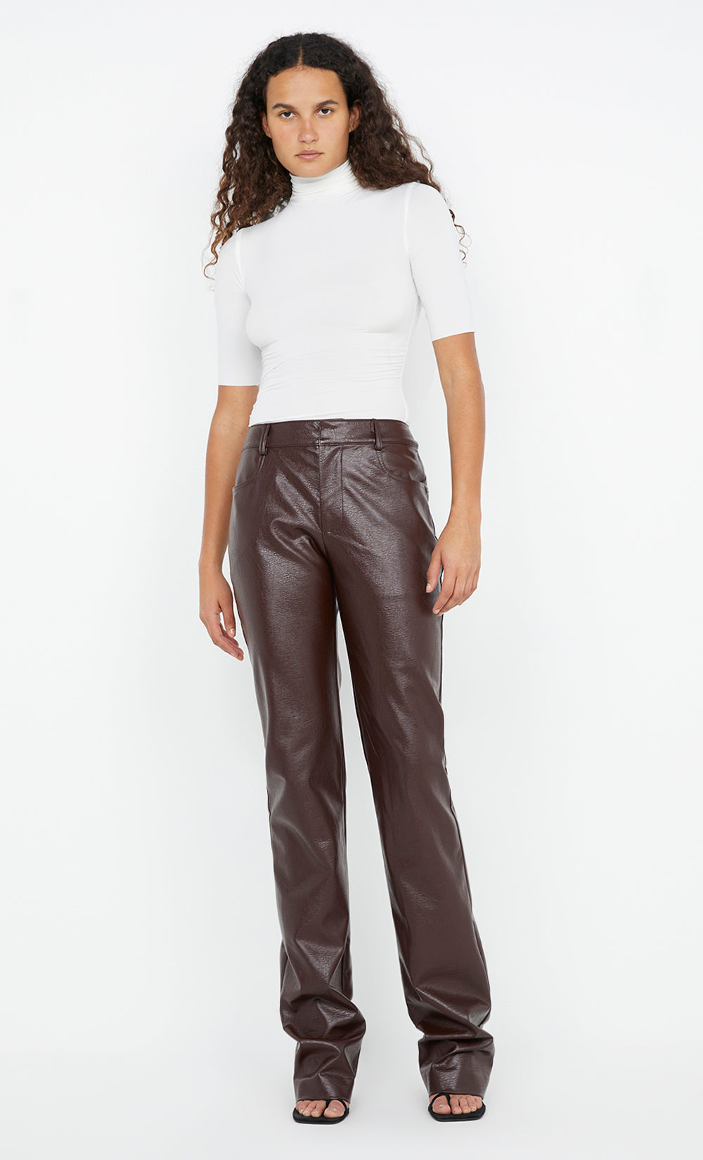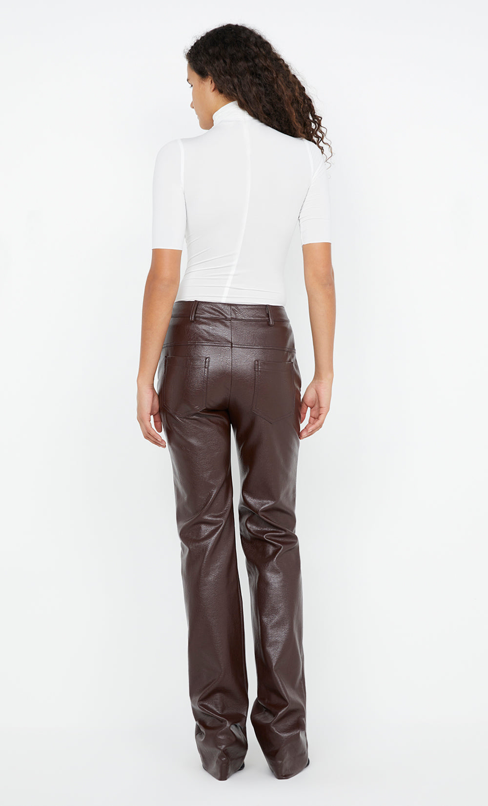 The BEC + BRIDGE Scylla Pant in Burgundy is a sleek, straight-leg trouser made from premium PU fabric. Designed with a waistband, belt loops, and a back yoke, these trousers are both stylish and functional. Featuring a fly front zip and hook-and-bar closure, they also include side pockets at the front and patch pockets at the back for added practicality, and finished with a clean blind hem. Pair with BEC + BRIDGE Vida Skivvy Top for a chic and sophisticated ensemble for a night outs.
