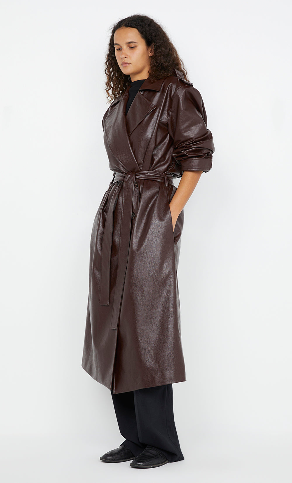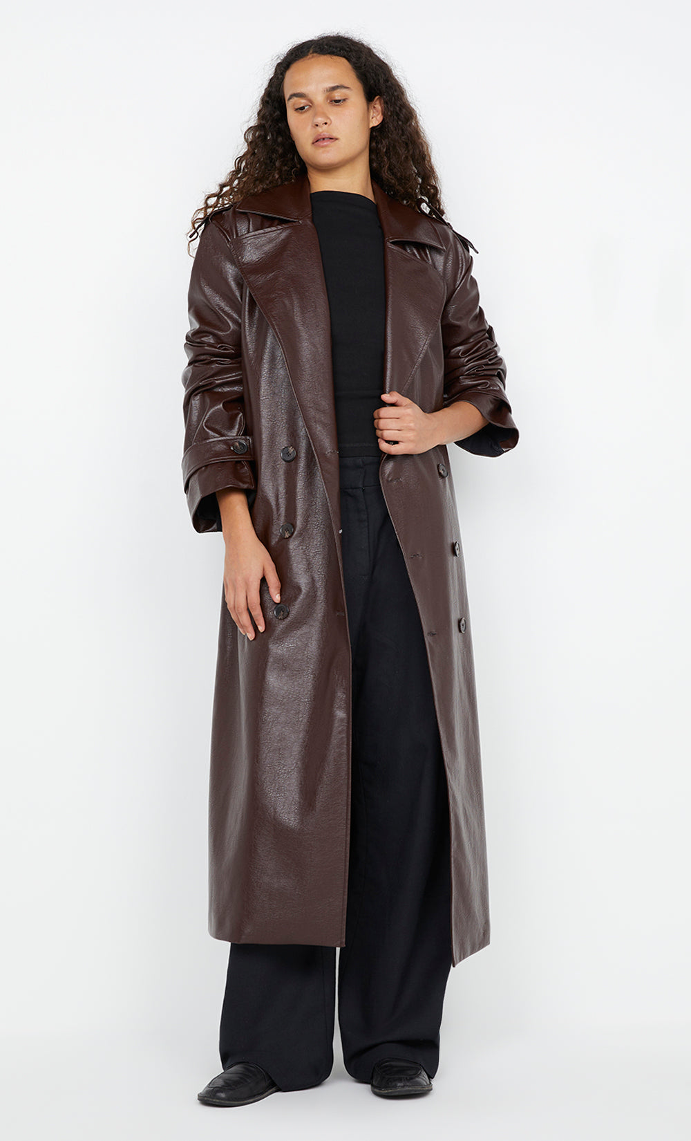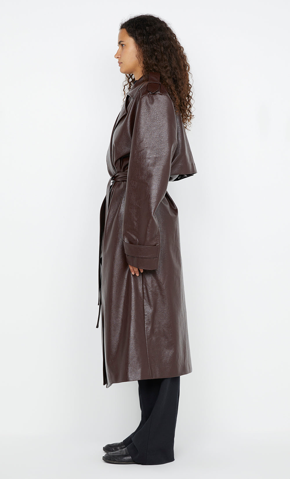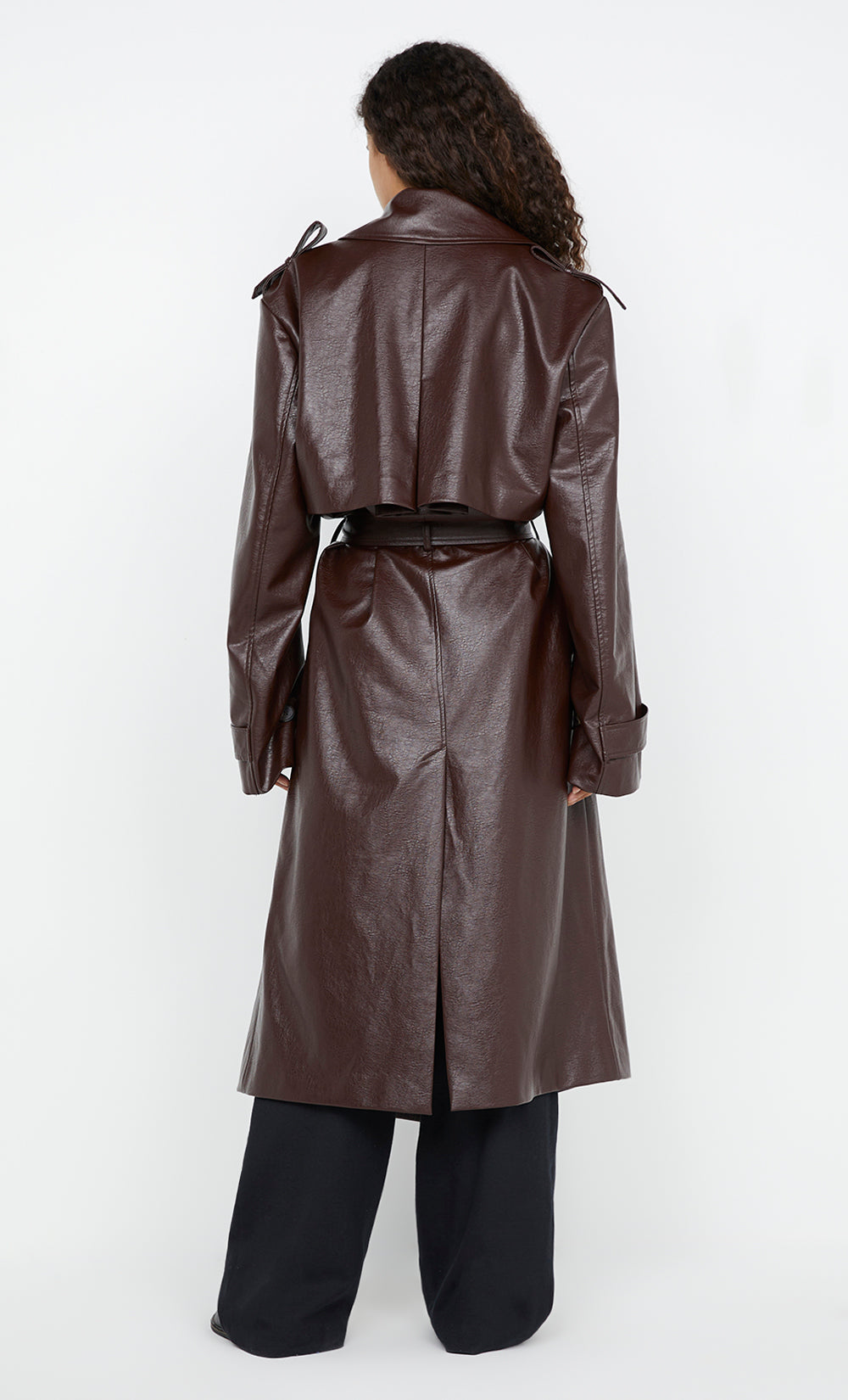The BEC + BRIDGE Scylla Trench Coat in Burgundy is a classic double-breasted trench coat cut from PU with an oversized fit. It features dropped shoulder seams, cuff straps, and epaulets for added detail. The coat is designed with a back storm shield and a vent at the centre back, along with belt loops and a waist tie for a customizable fit. Fully lined and finished with a blind hem, this coat is perfect for effortless layering during cooler days. Perfect for adding a chic touch to your outfit on cold evenings, office commutes, or weekend outings.