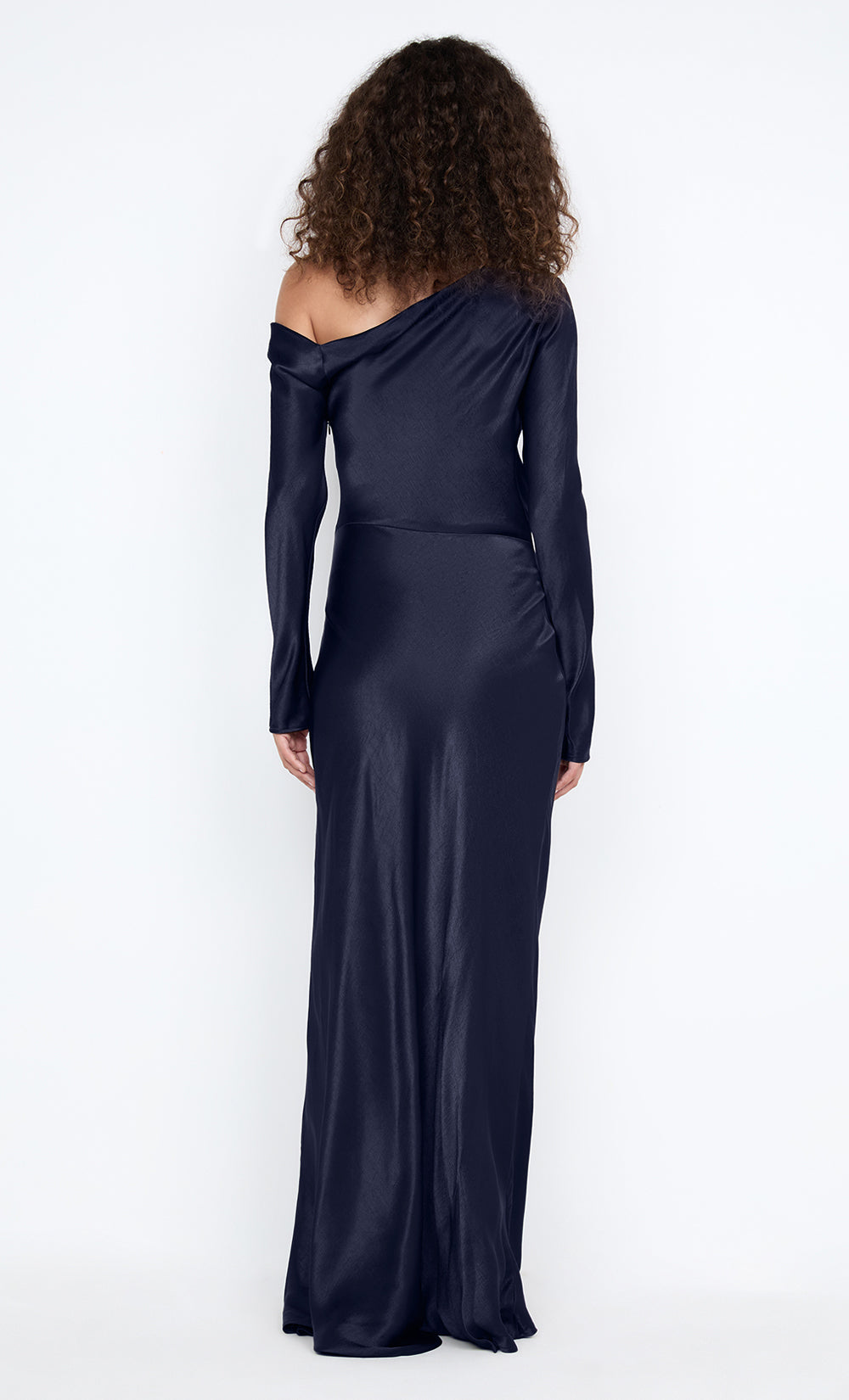 Siena Asym Maxi Dress in Ink. This elegant bias-cut maxi dress features an asymmetric neckline and a front leg split, creating a sophisticated silhouette perfect for an elegant night out or a glamorous evening event.