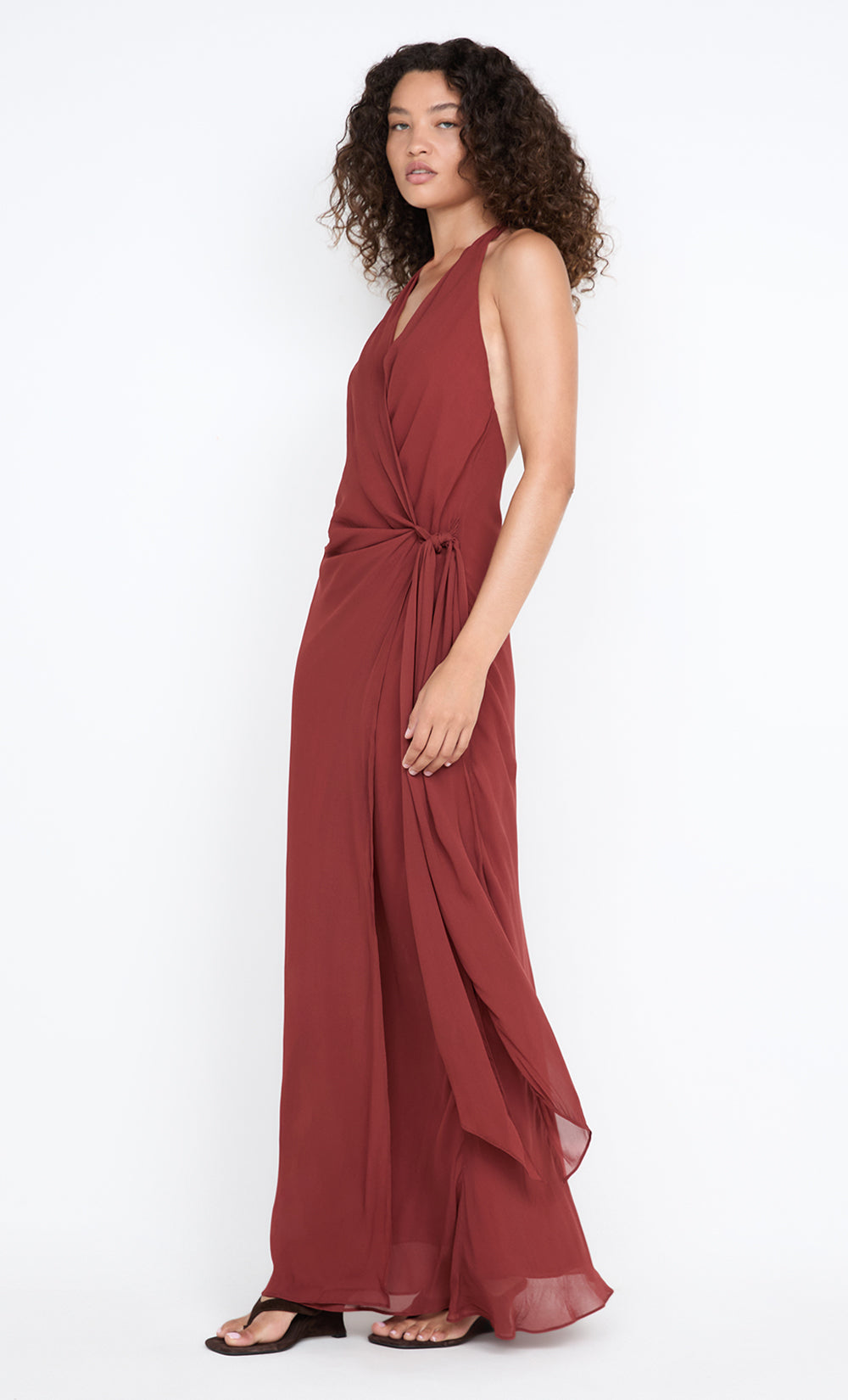 Soneva Wrap Dress in Rust. Discover our timeless best-seller blending a chic halter neckline with a graceful low-waist tie, ideal for unforgettable evening and formal events.