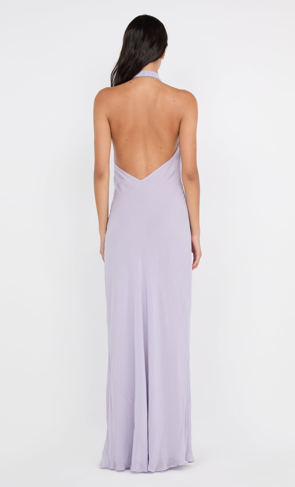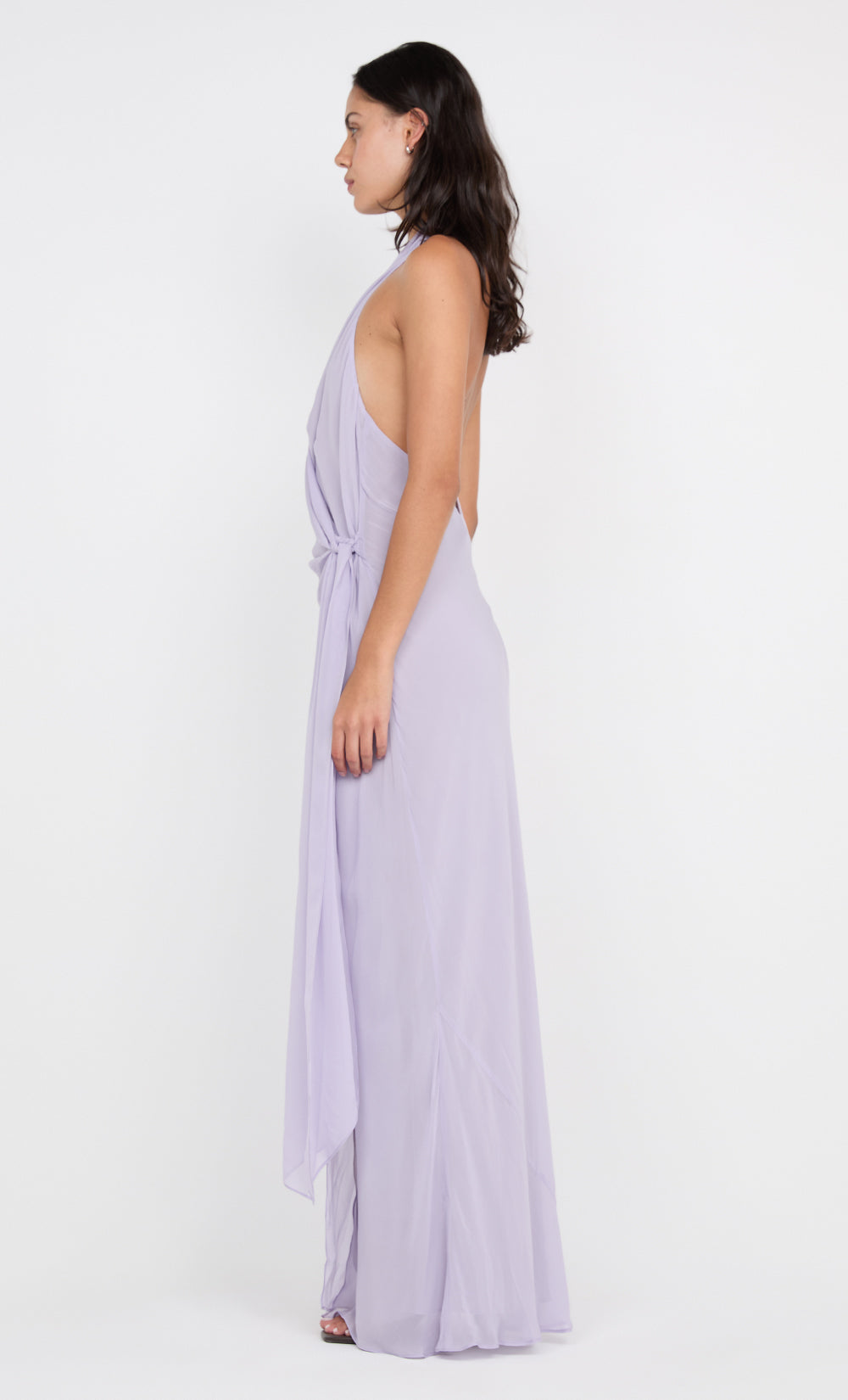 Soneva Wrap Dress in Wisteria. Discover our timeless best-seller blending a chic halter neckline with a graceful low-waist tie, ideal for unforgettable evening and formal events.